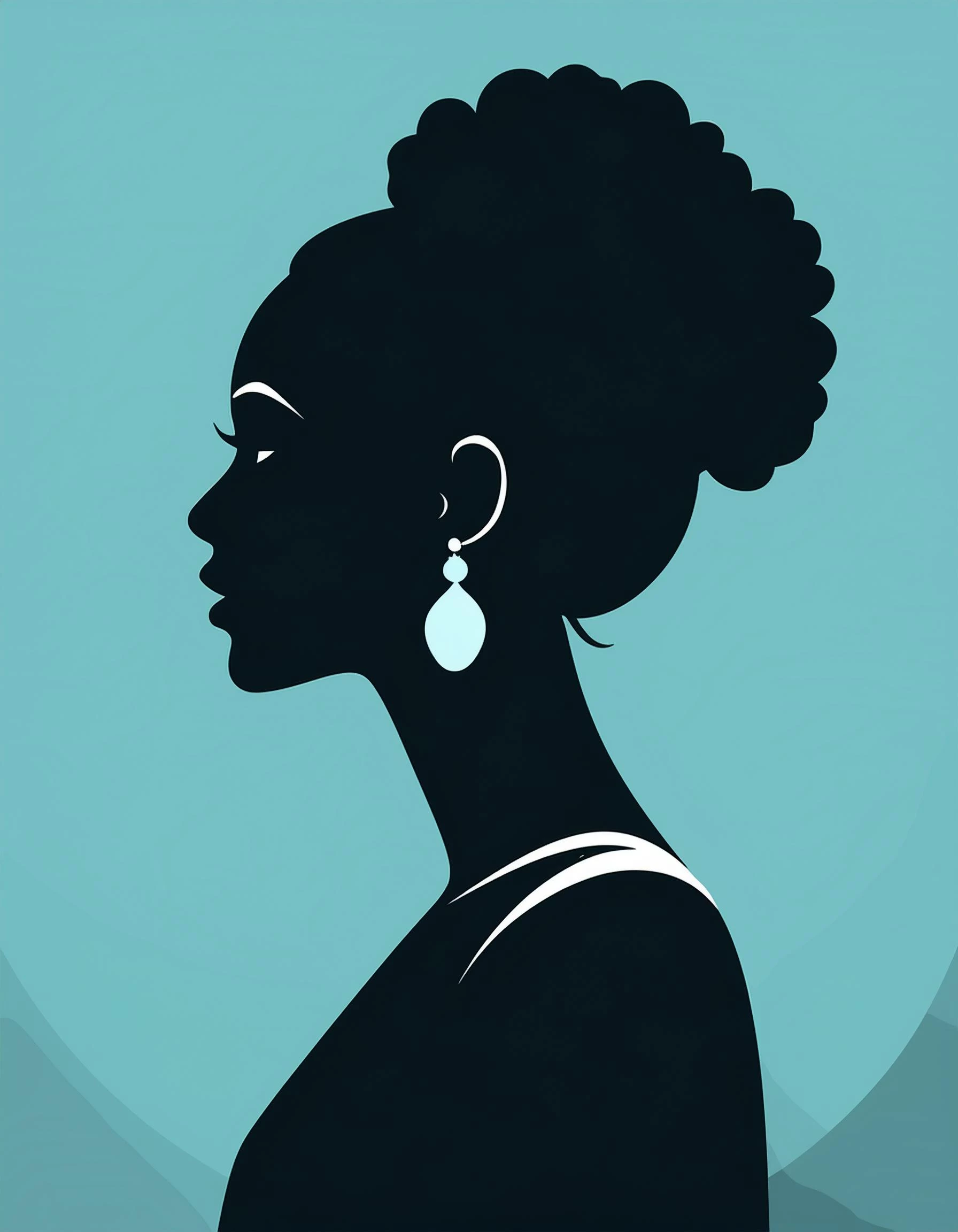 solid black silhouette of woman with a bouffant hairdo on light blue background