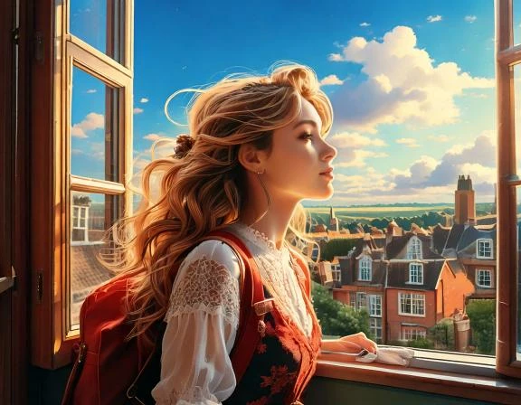 "A Traditional British Girl is watching the horizon of the sunny afternoon sky from a traditional UK home from her window".