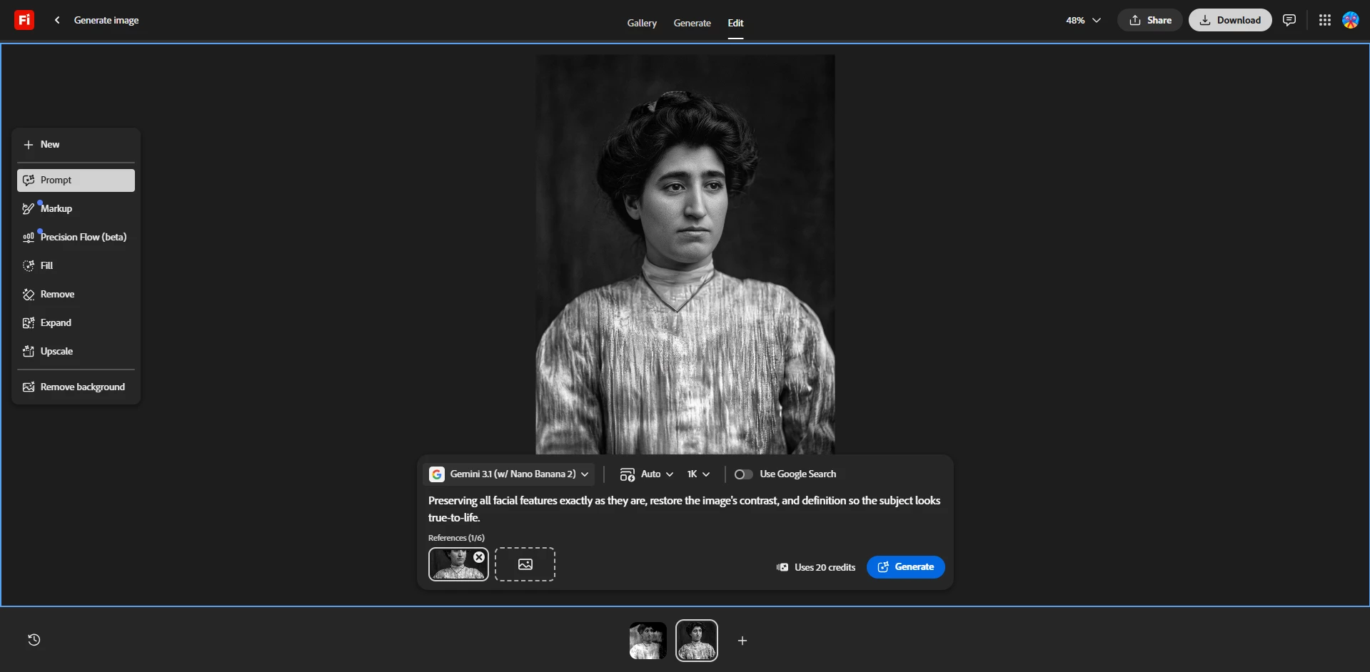 For this workflow, I decided to use Edit > Gemini 3.1 model and used this prompt: “Preserving all facial features exactly as they are, restore the image's contrast, and definition so the subject looks true-to-life”. The results returned a better version: