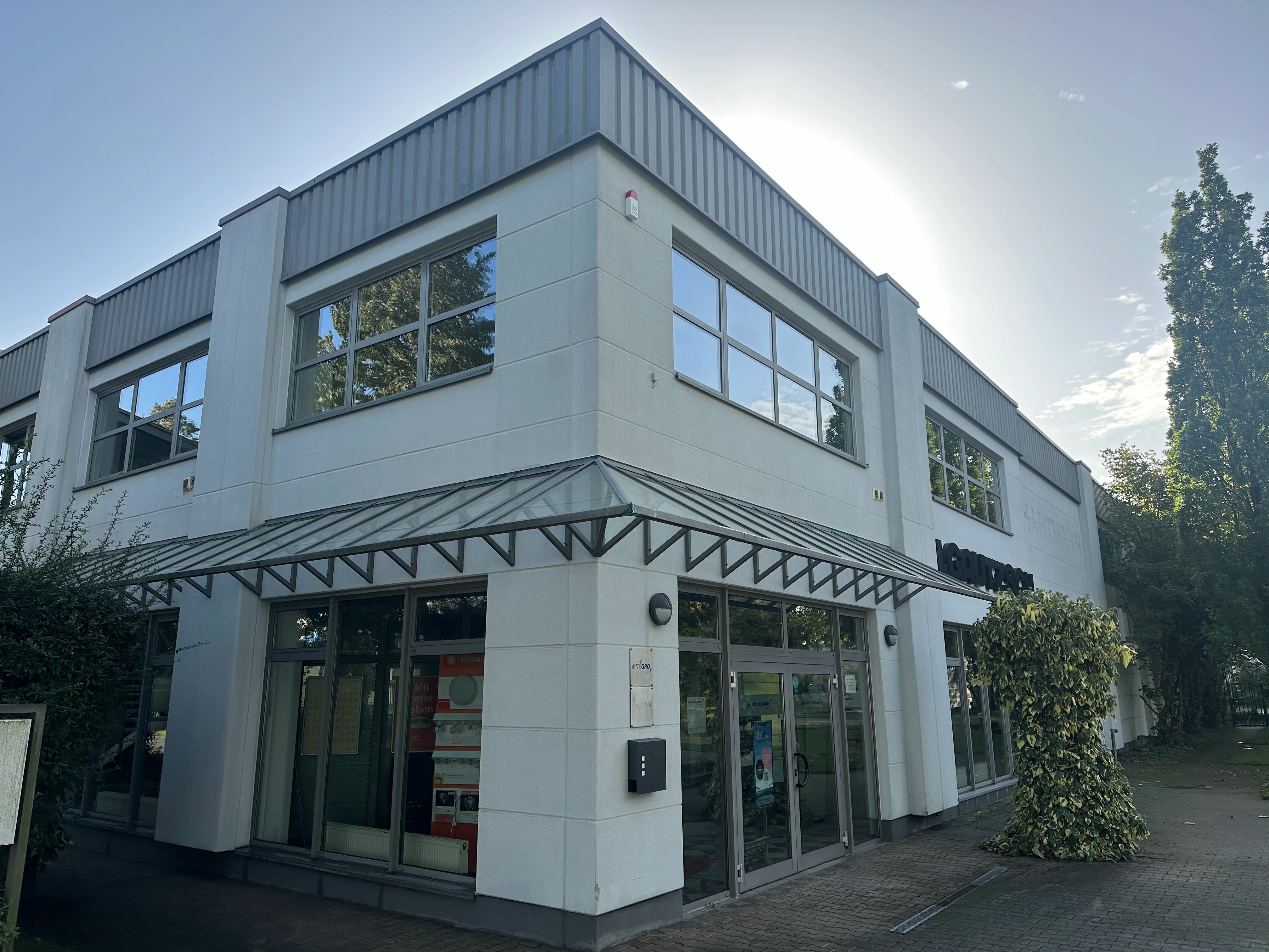 I want to paint the exterior of my company's building, and I need ideas regarding the color and design. This company is engaged in the production and sale of PVC windows and doors, and the predominant color of our design elements is green. I will send a photo of the building and the company logo, and we want the logo to be incorporated into the building's wall. The main color of the building should be white with some green accents.