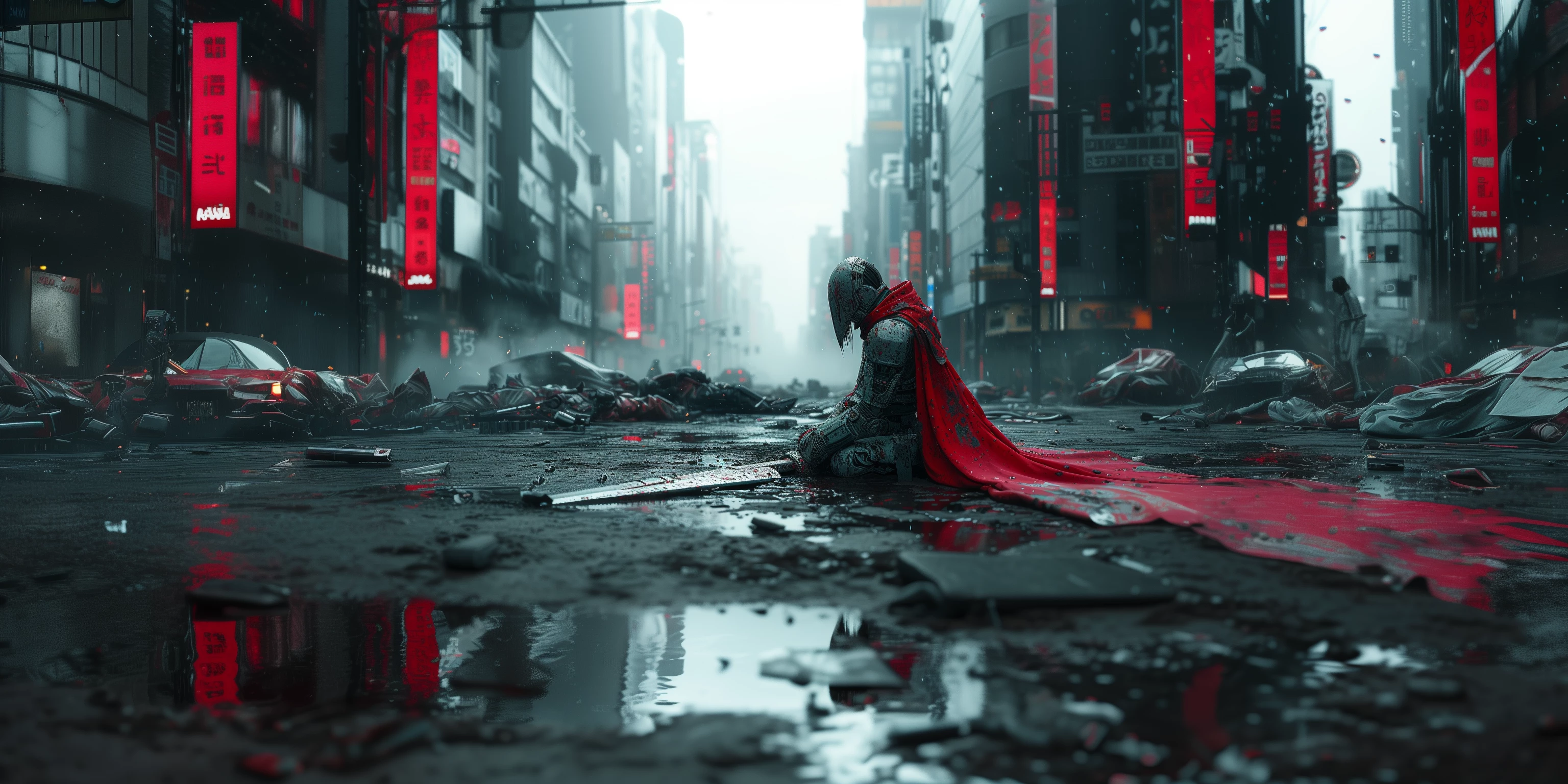 Here's one that was rejected no matter what I prompted. "camera slow push in on a weary kneeling sci-fi character wearing a red cape in the rain in the middle of a cyberpunk city with red neon lighting"