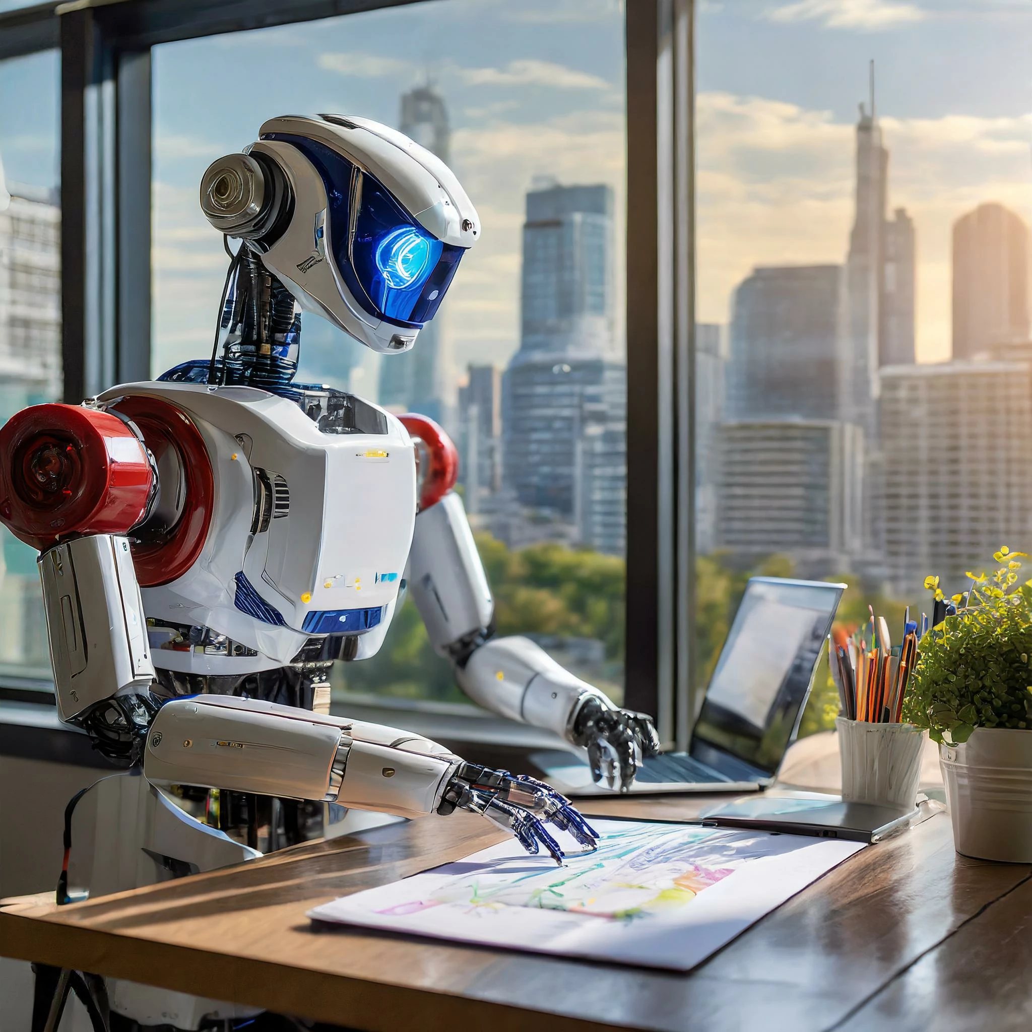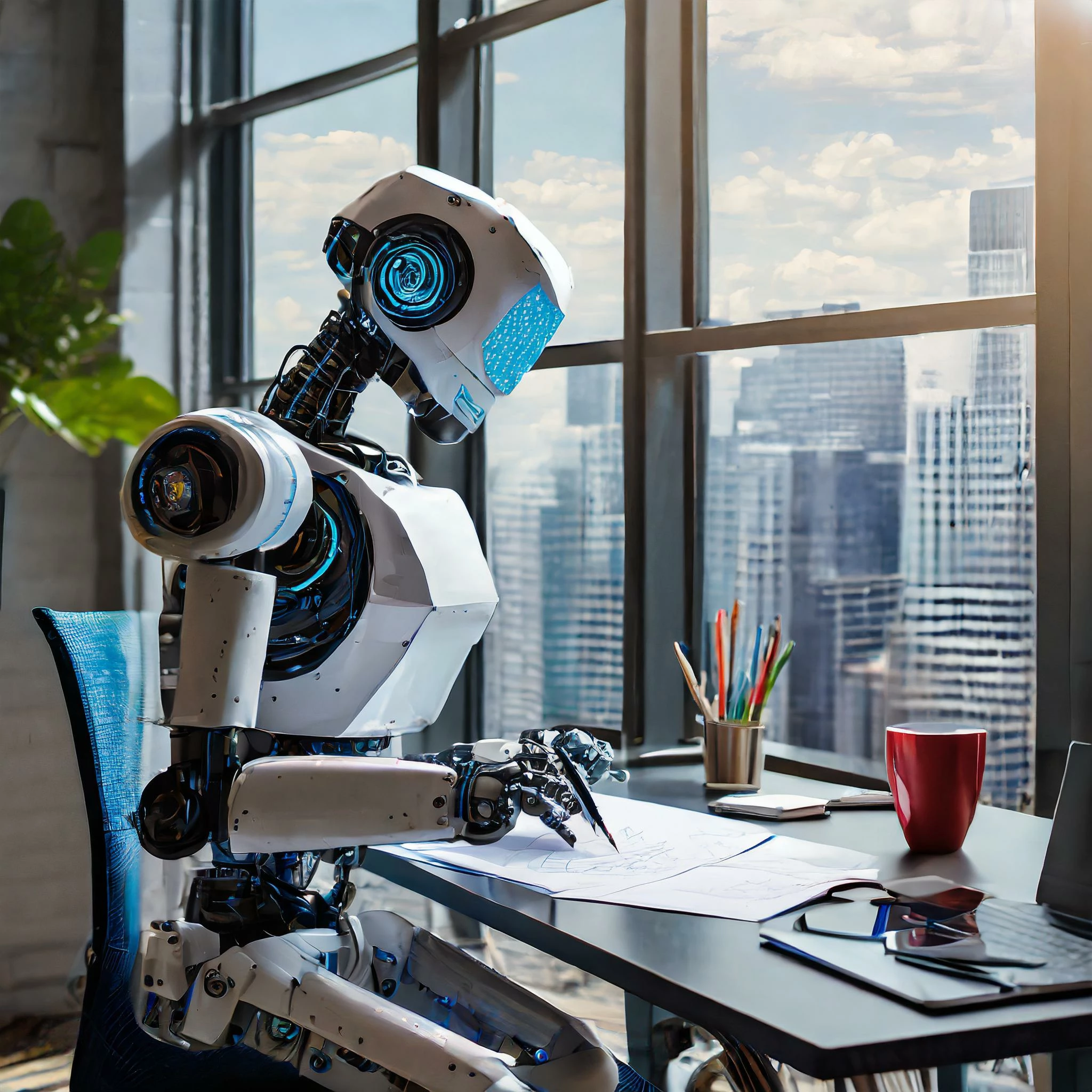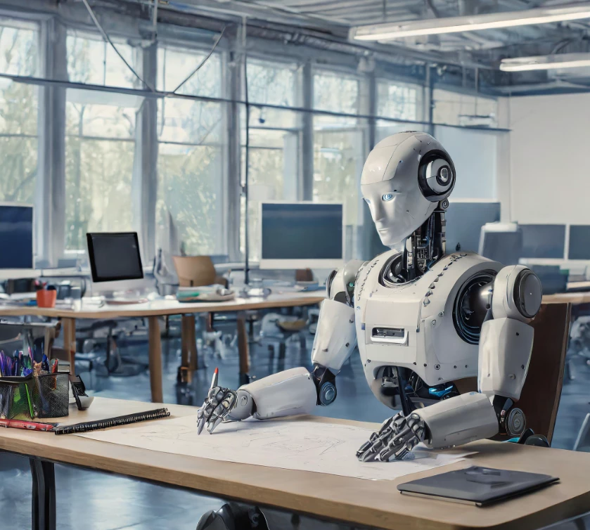 "Photo of a robot seated at a drawing table working on an illustration at an advertising agency. In the background are endless rows of empty work stations."