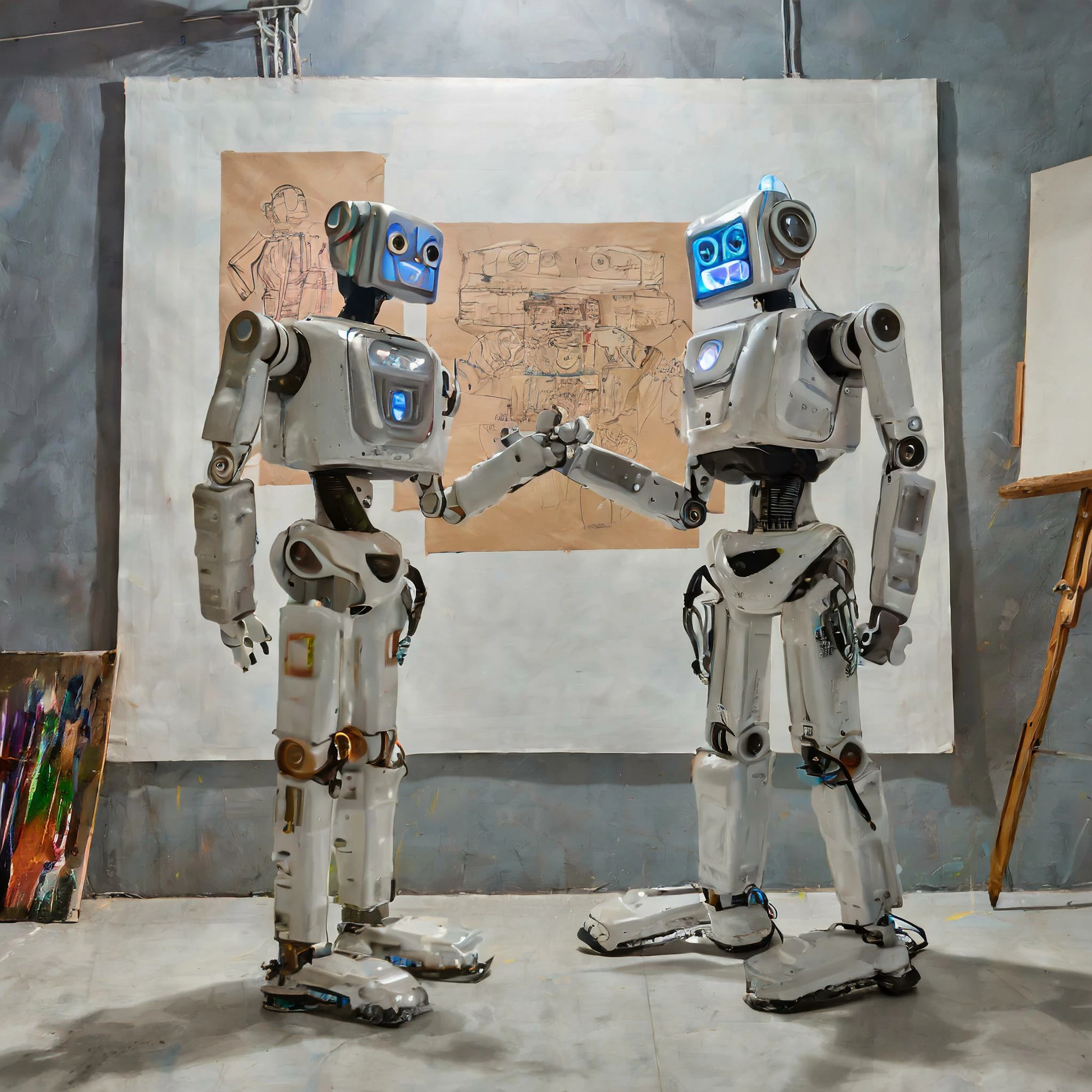 Photo of two robots at an art show arguing about an illustration hanging on the wall, "Yeah, but is it art?"