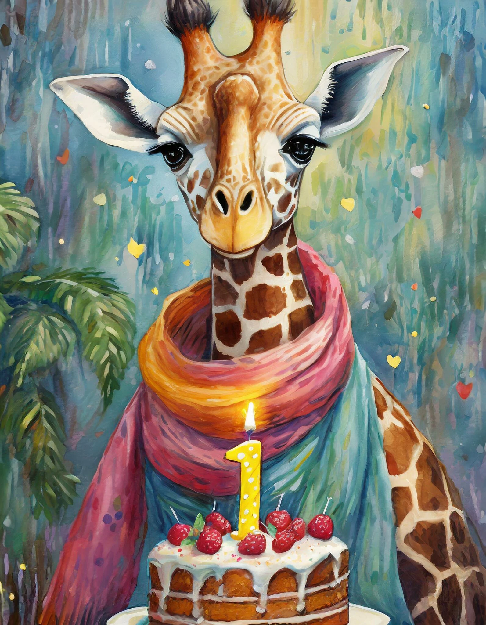 Prompt: A giraffe with a cake with a candle number one, wearing a beautiful bright scarf, oil painting