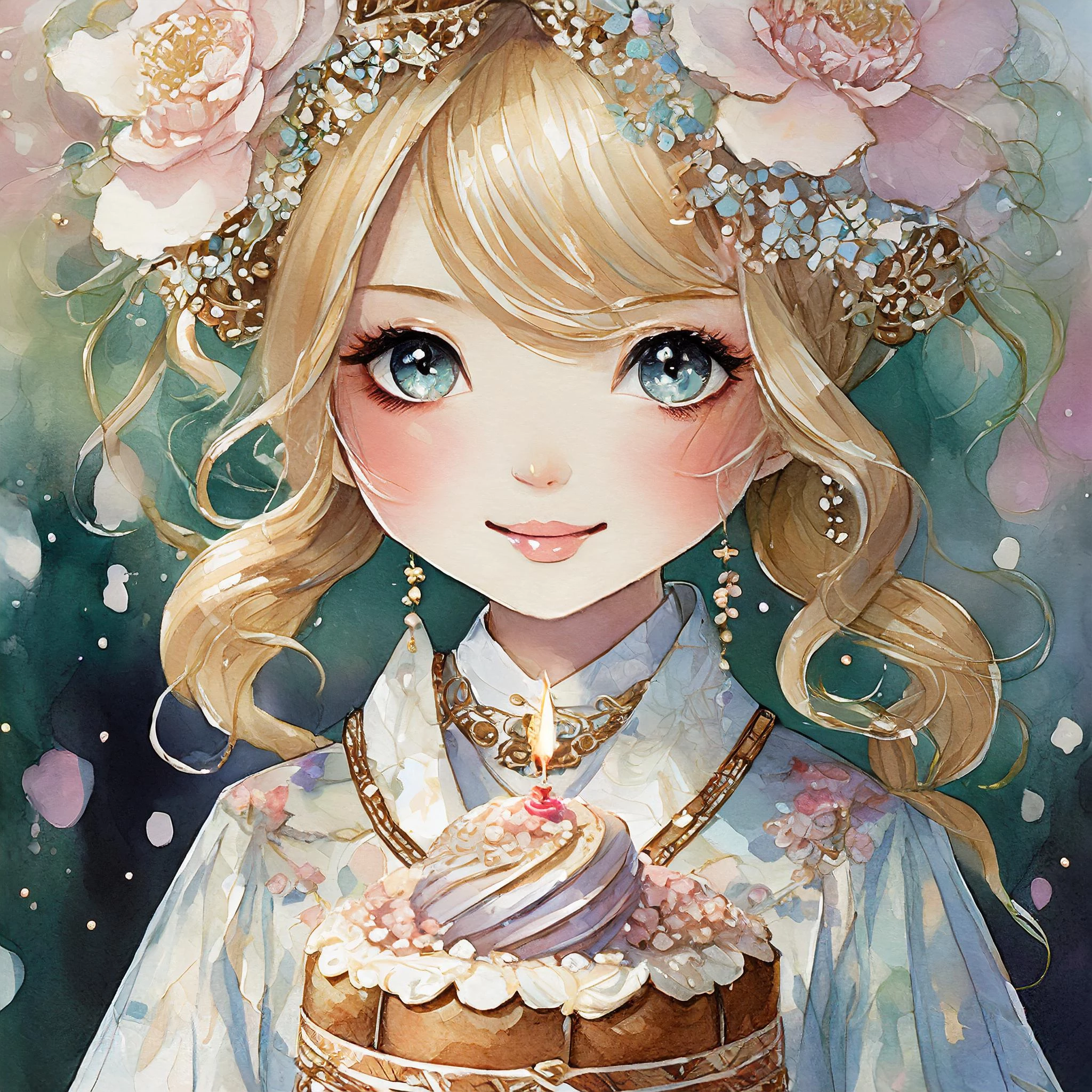 detailed wallpaper like water colored drawing of pretty girl, wavy blonde hair wearing sheer baroque dress with elegant frills, white growing skins, jewelry eyes, perfect symmetrical face with brush cheeks, she has 1st year anniversary cake a candle on it. art,pastel_colors