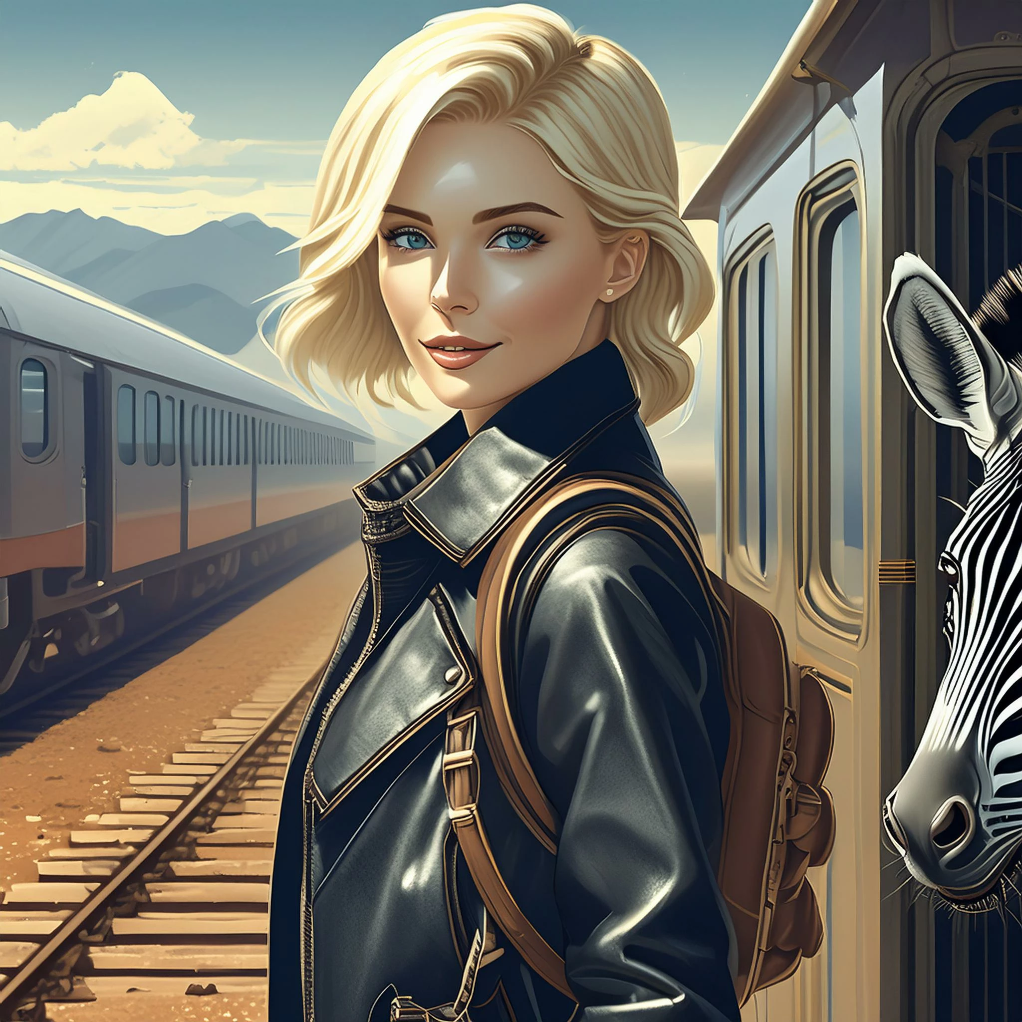 avatar in film noir style of a female blonde woman wearing a black leather jacket with a zebra deboarding a train at an old train station in the middle of nowhere