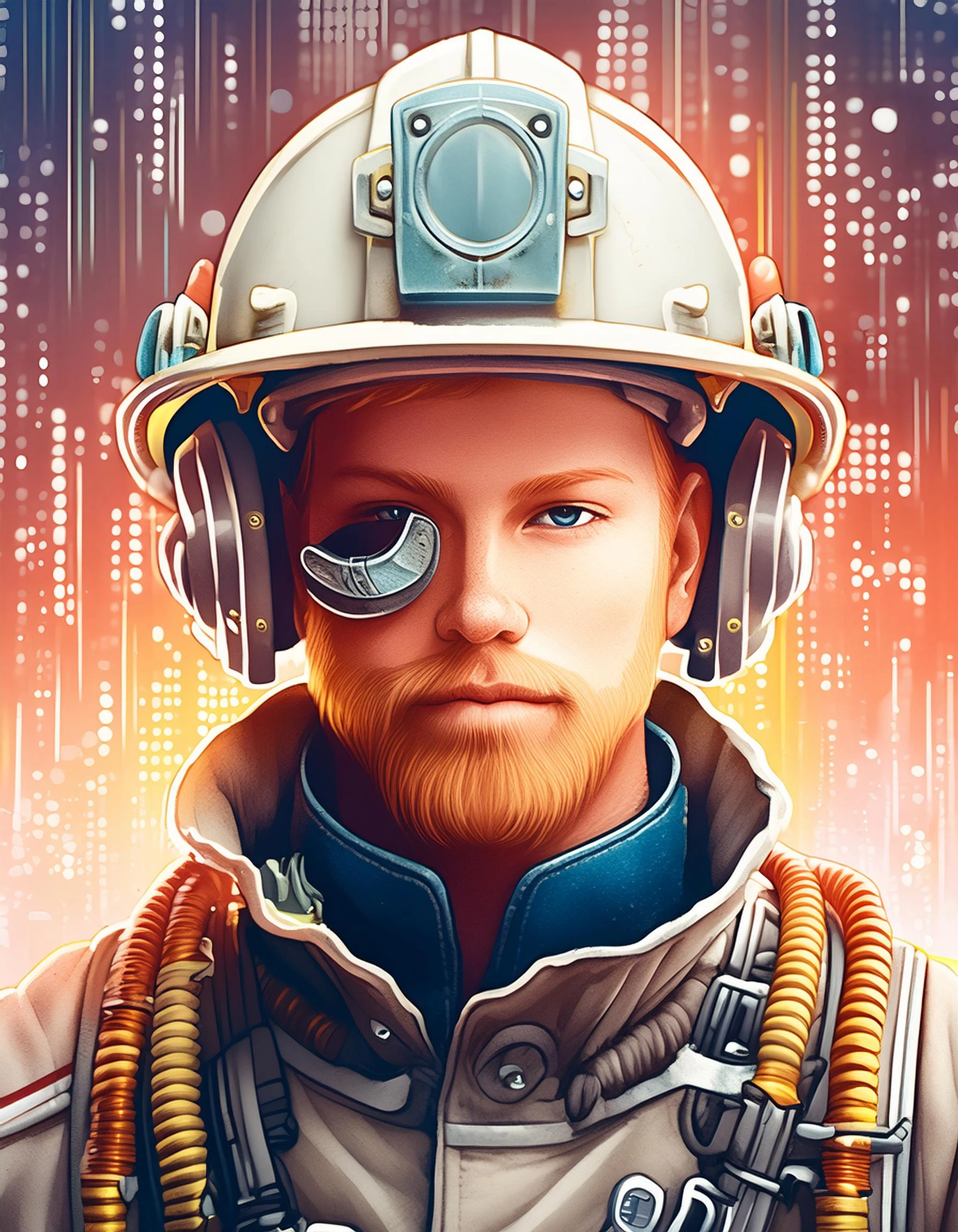 Prompt: young blond red-bearded caucasian male firefighter wearing new-york-style-firefighting-helmet-with attached cybernetic left eye-patch in cyber matrix, binary bytes mainframe operating-system circuits networks