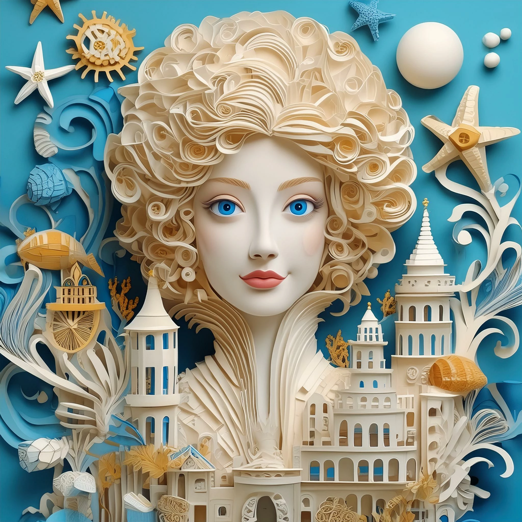 Paper sculpture style avatar young female with baroque elements, blond curly hair, and blue eyes. Elements in the photo should include sea life, art supplies, and international architecture elements.