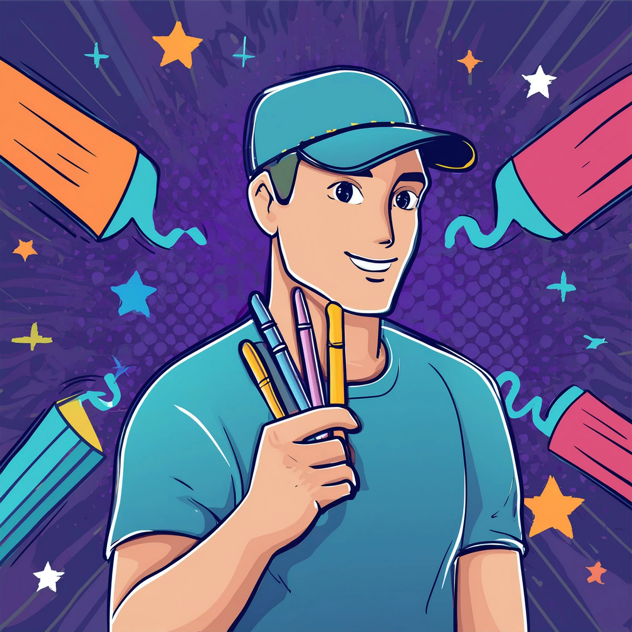 Male Designer wearing a cap holding pens in front of doodles. Tried several files and used a structural reference pic but felt this was more fun... and no random floating pens and added beards!
