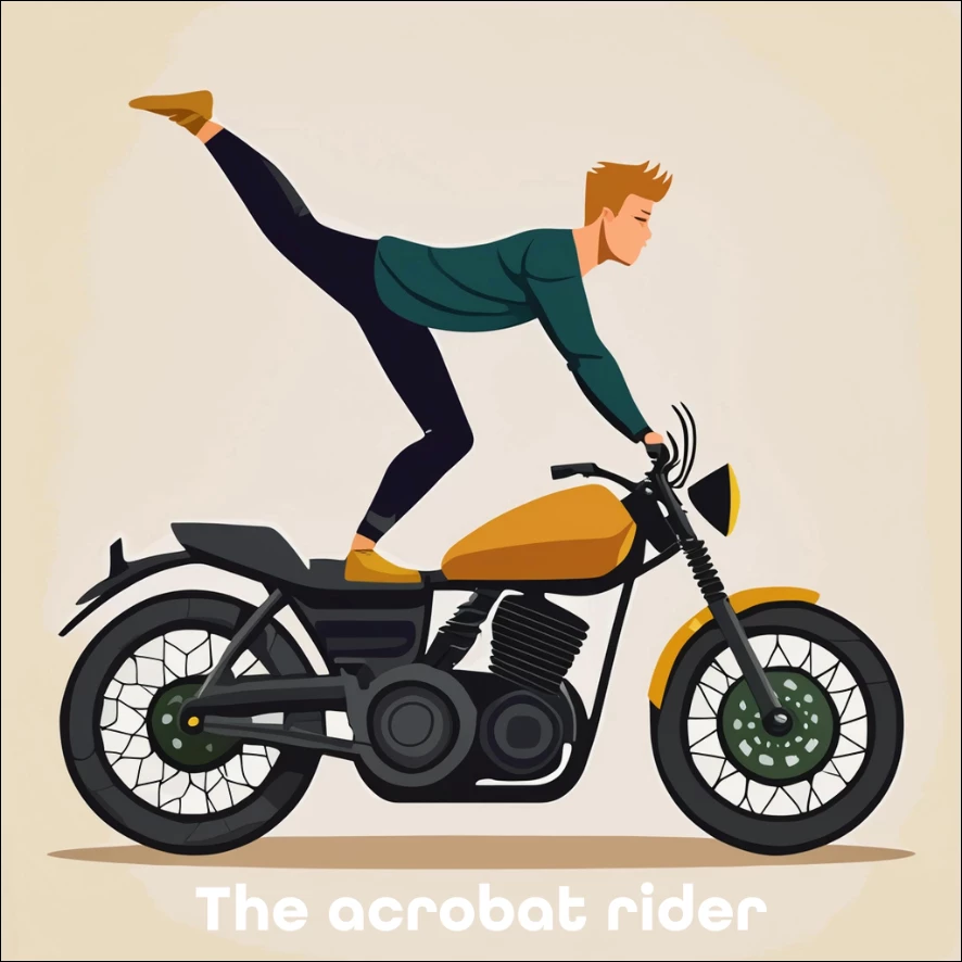 Prompt : "Un homme faisant l'acrobate sur une moto, debout sur la selle, vue de profil."