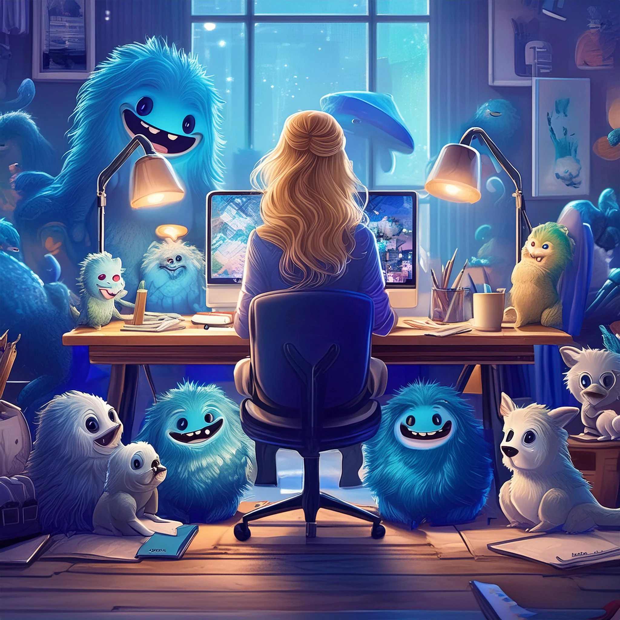 My avatar is surrounded by Blue Monsters (company, clients... kiddos lol) and a few other creatures symbolizing family pets. She is always busy doing something, especially at her computer. Facing away, she’s elusive and tends to go against the grain.