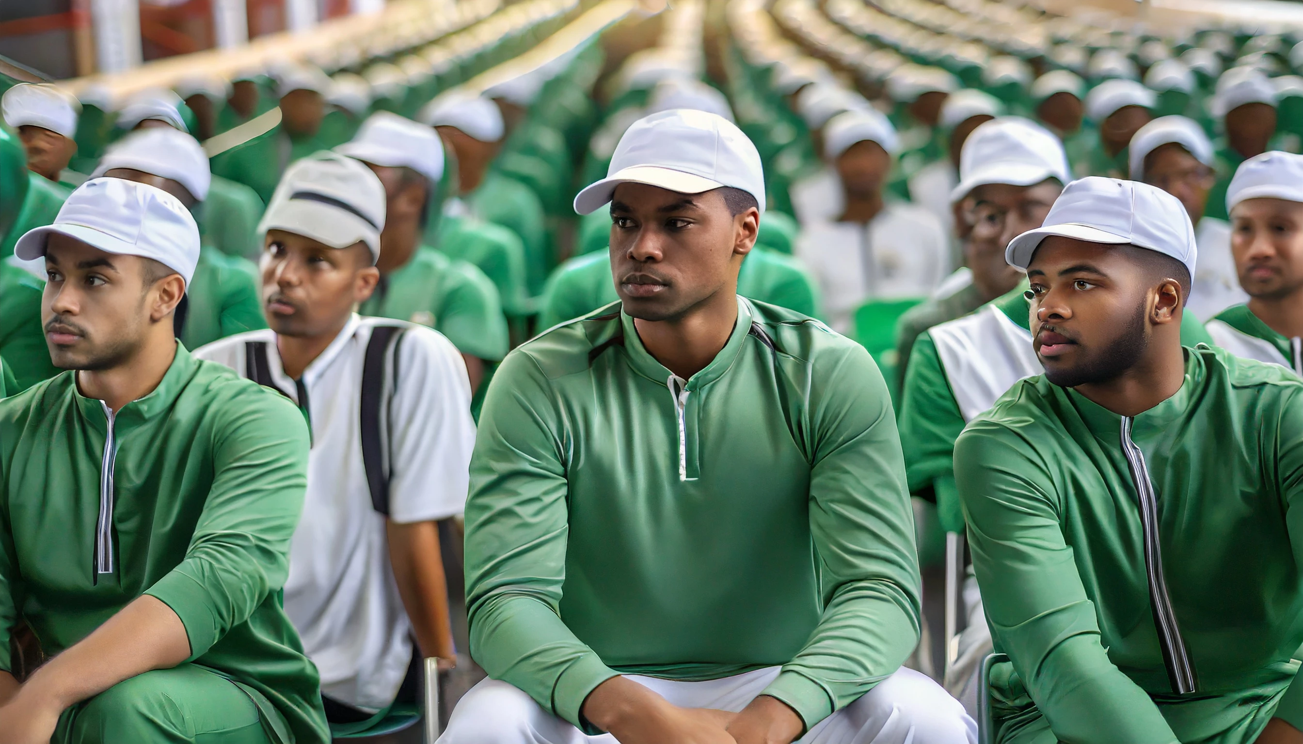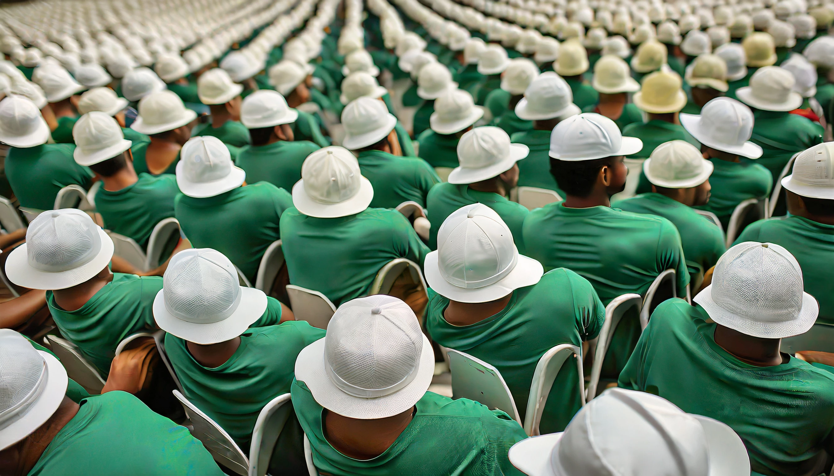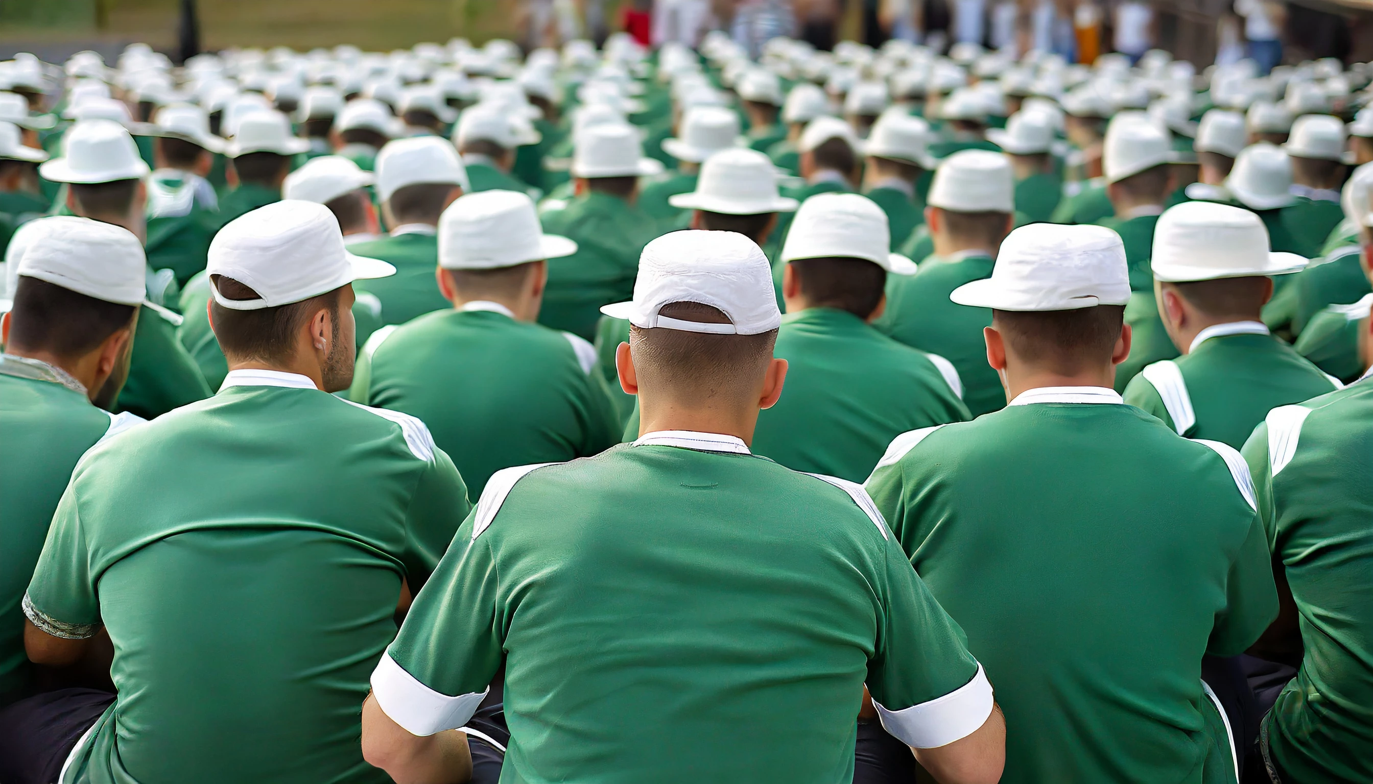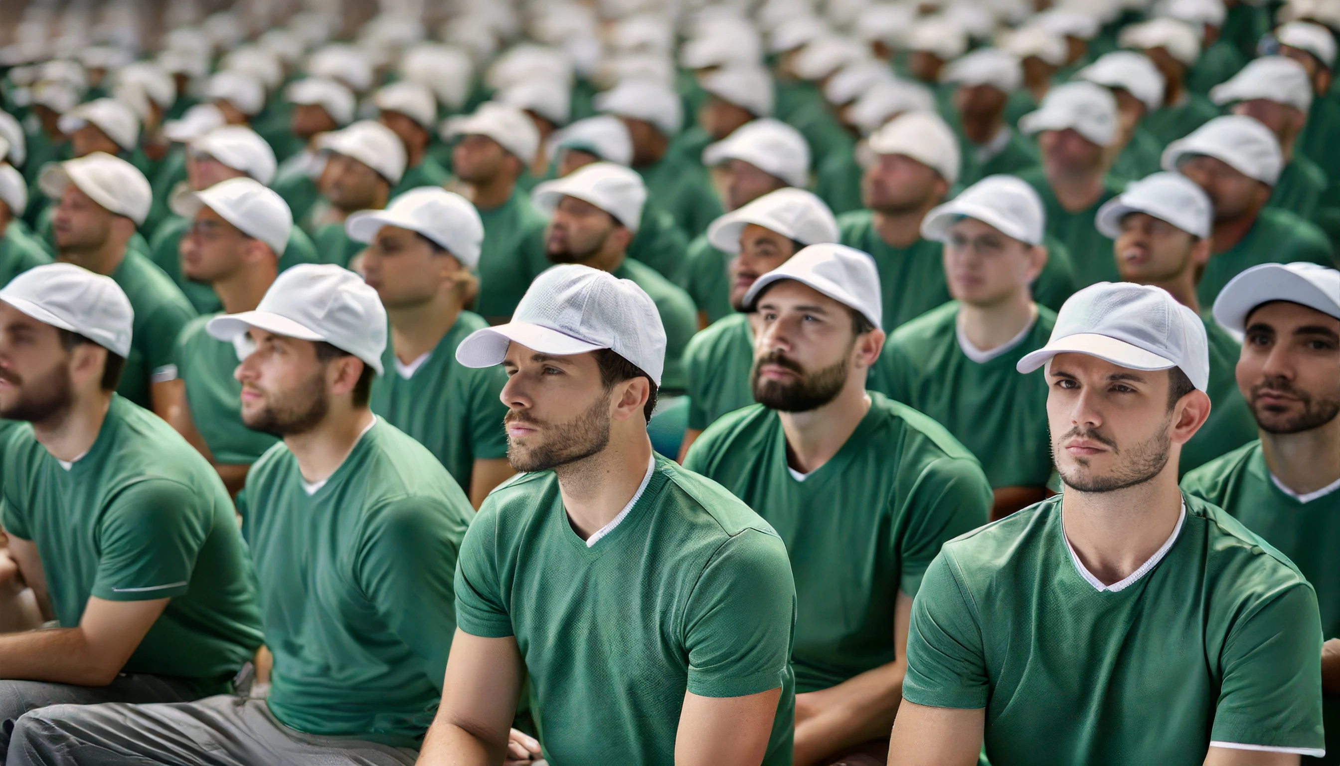 Photo couleur d'une nombreuse assemblée d'hommes blancs qui nous regardent, tous assis dans le même sens vers nous , ayant tous les mêmes vêtements VERTS, TOUS UN BONNET BLANC IDENTIQUES et TOUS LE MÊME VISAGE TRISTE ET INQUIET TOURNÉ VERS NOUS