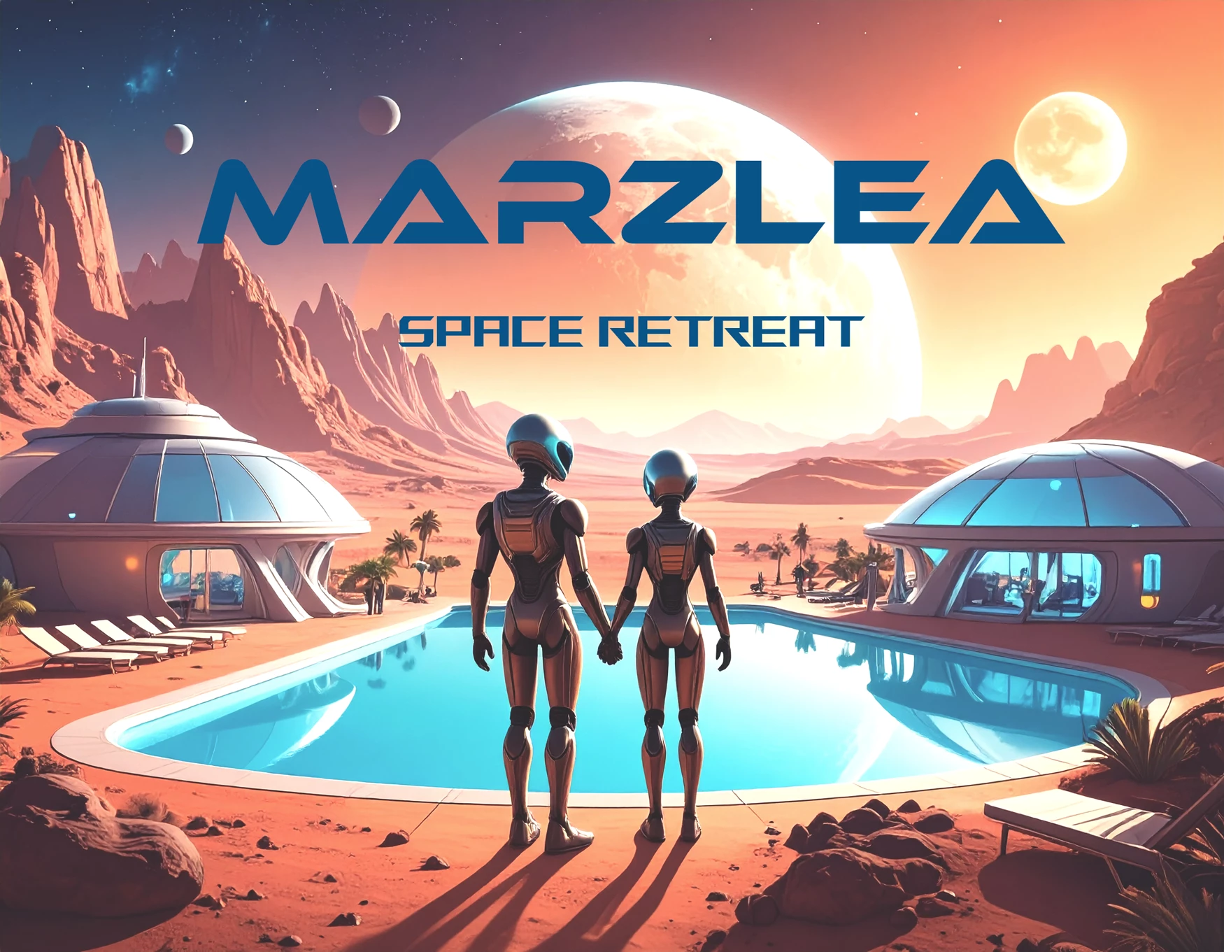 The image was created in Firefly and then moved into Photoshop where I made some minor adjustments and added the type. The prompt was a space age resort on mars with a view of the moon and a swimming pool, add two aliens holding hands. Marzlea space retreat.