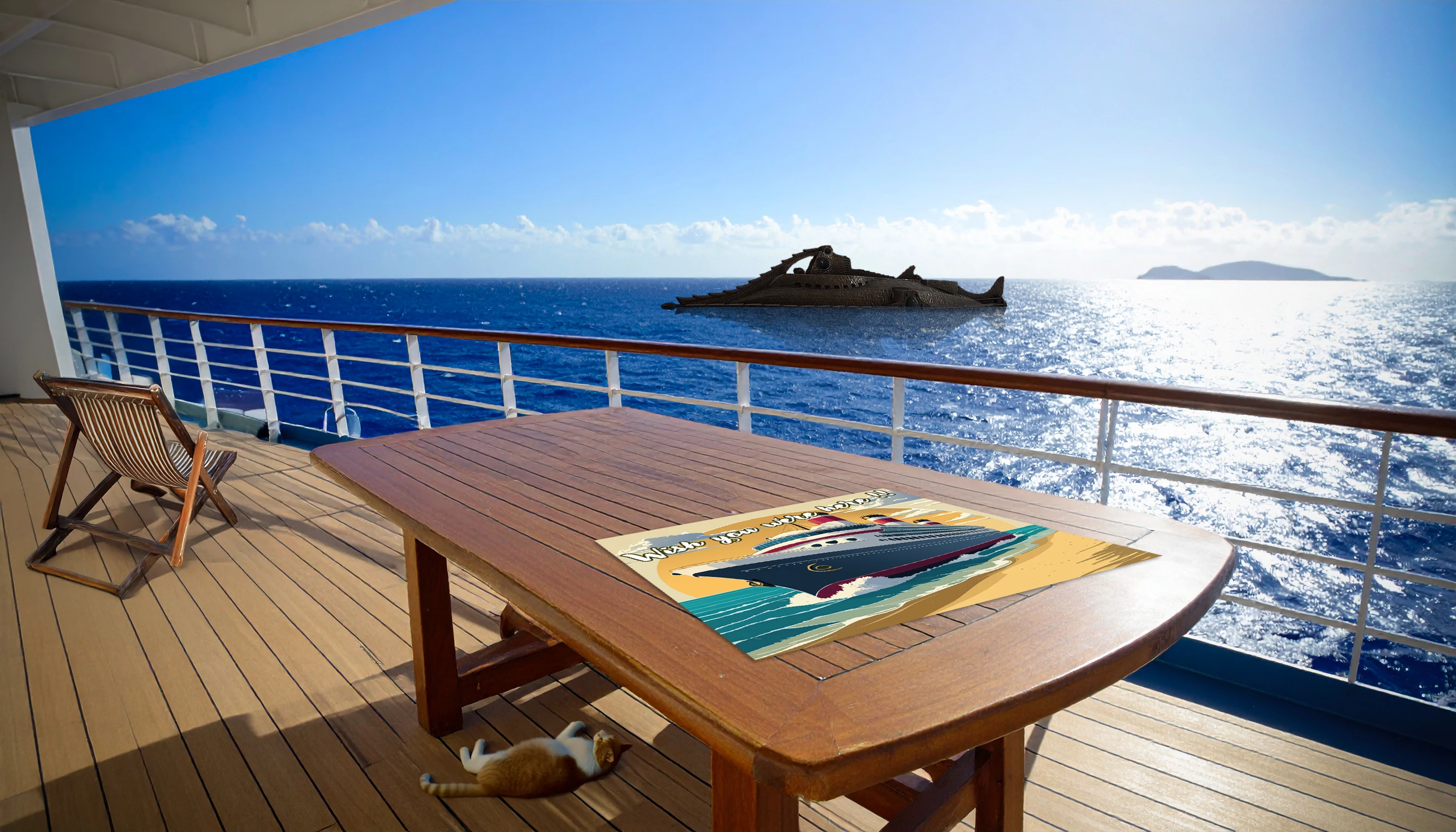 Poster - txt to vector illustrator, stock images, firefly cat and chair and table and foreground ship.