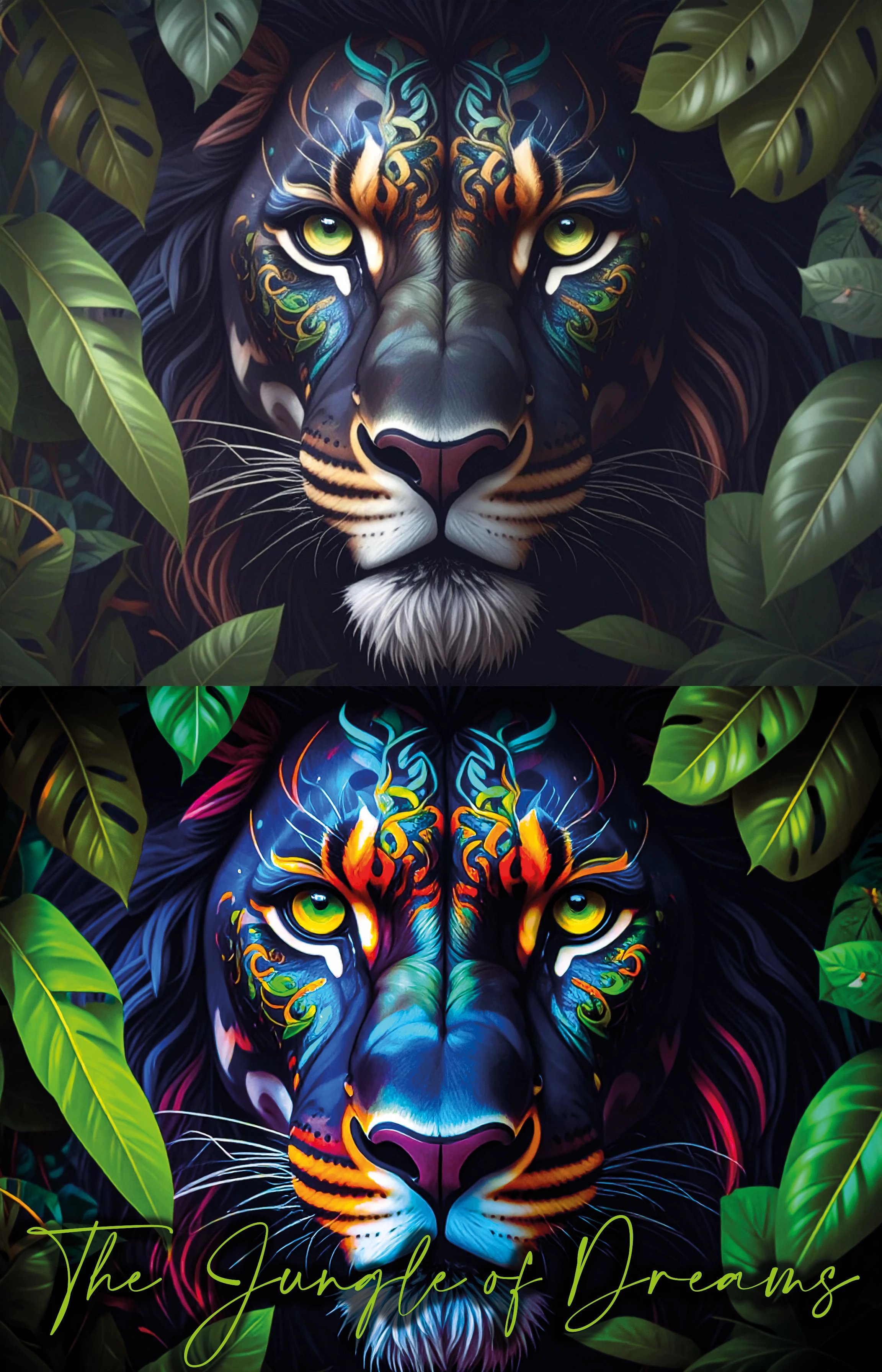 The jungle of dreams. Created in firefly. A before and after shot. Taken from firefly and used camera raw in photoshop, then created the font in illustrator, added it all in indesign, then a quick export.