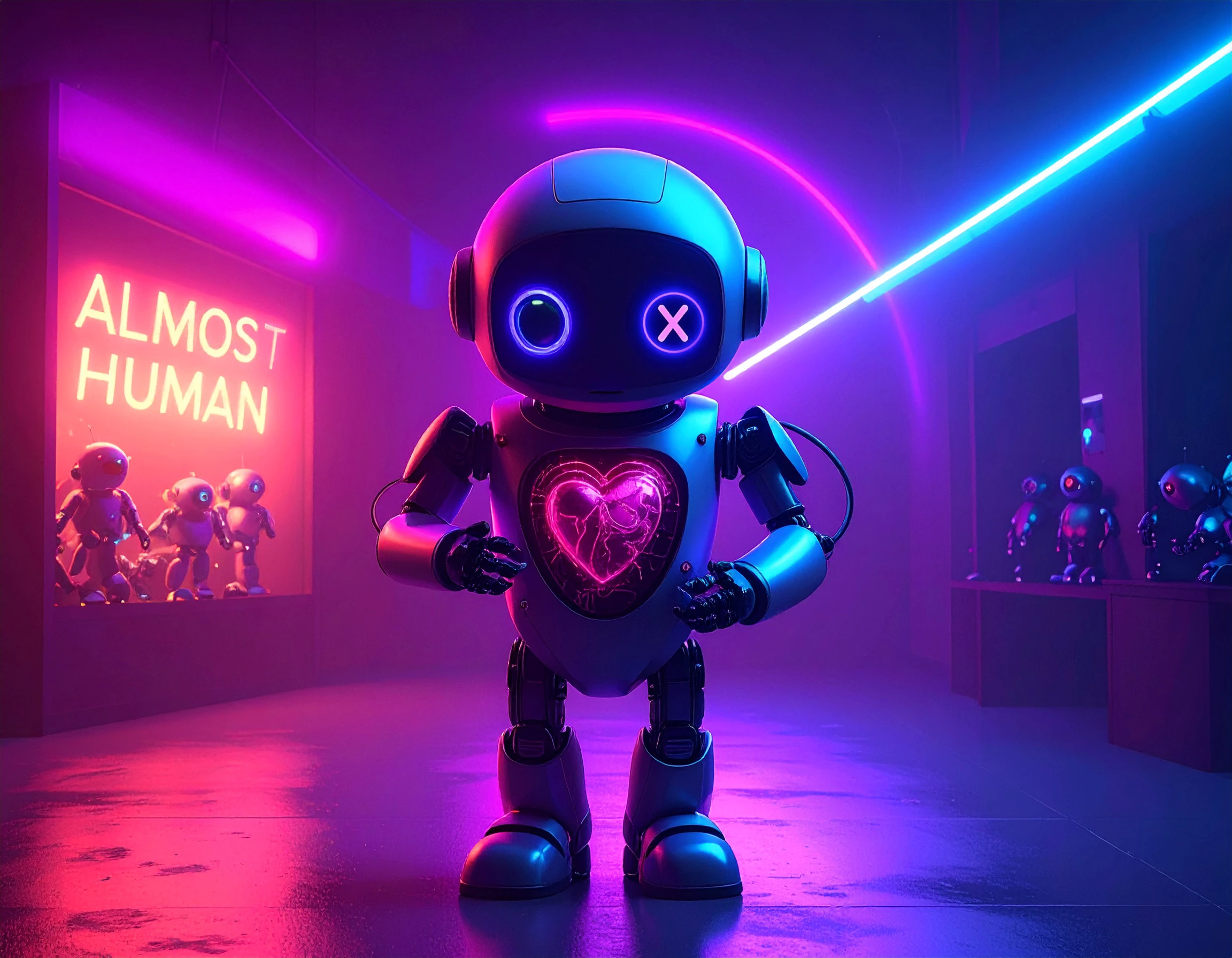 Prompt: In the center of the photo stands a single, cute robot with soulful eyes facing the viewer. Revealed Inside the robot's body is a small human-like metal heart inside the robot's ribcage. The robot's hands are encapsulating the heart and extended toward the viewer. Behind the robot is a flickering sign that says "almost human" and shows a shop full of smaller robots.
