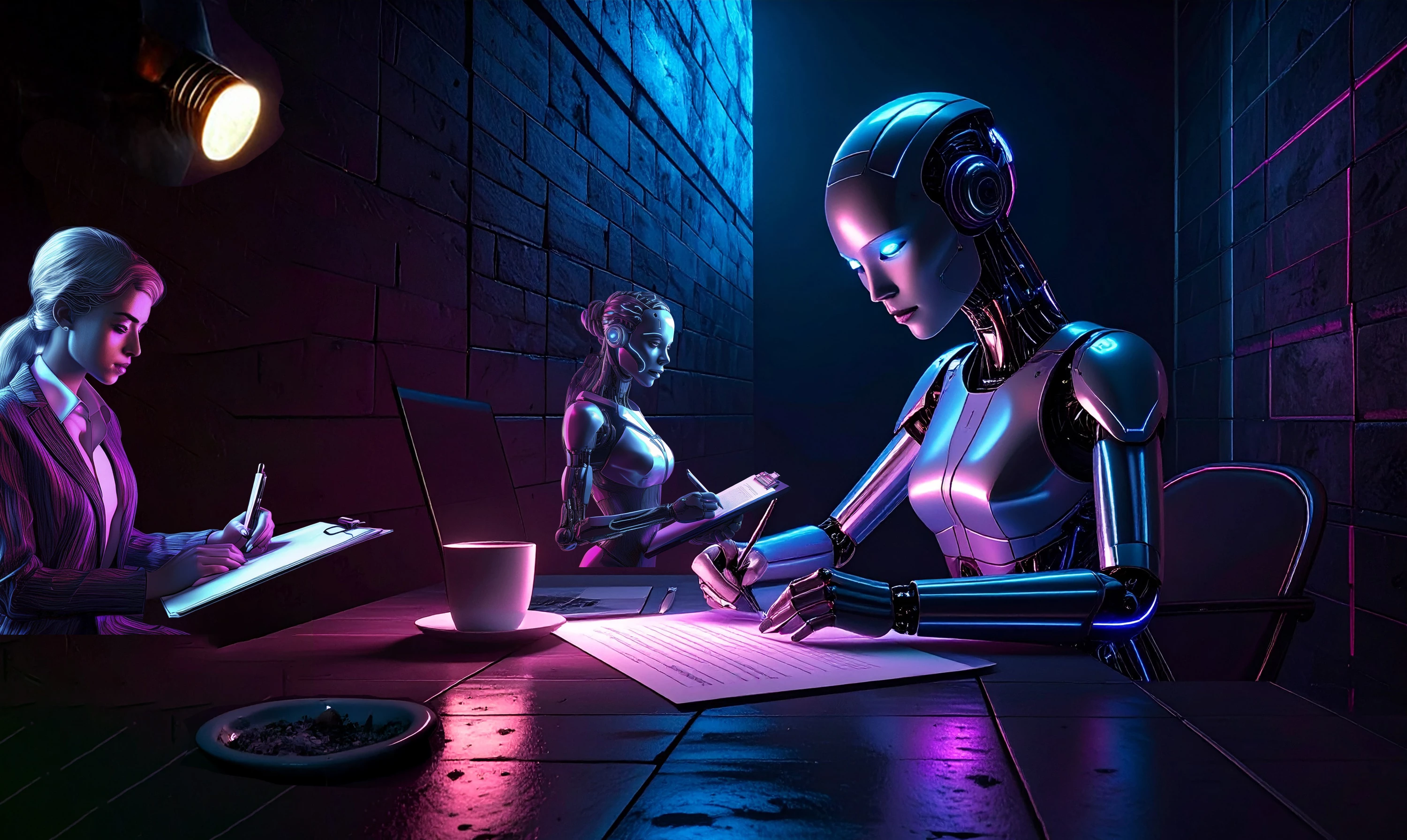 This image shows a robot being interviewed by a human in a futuristic HR office.