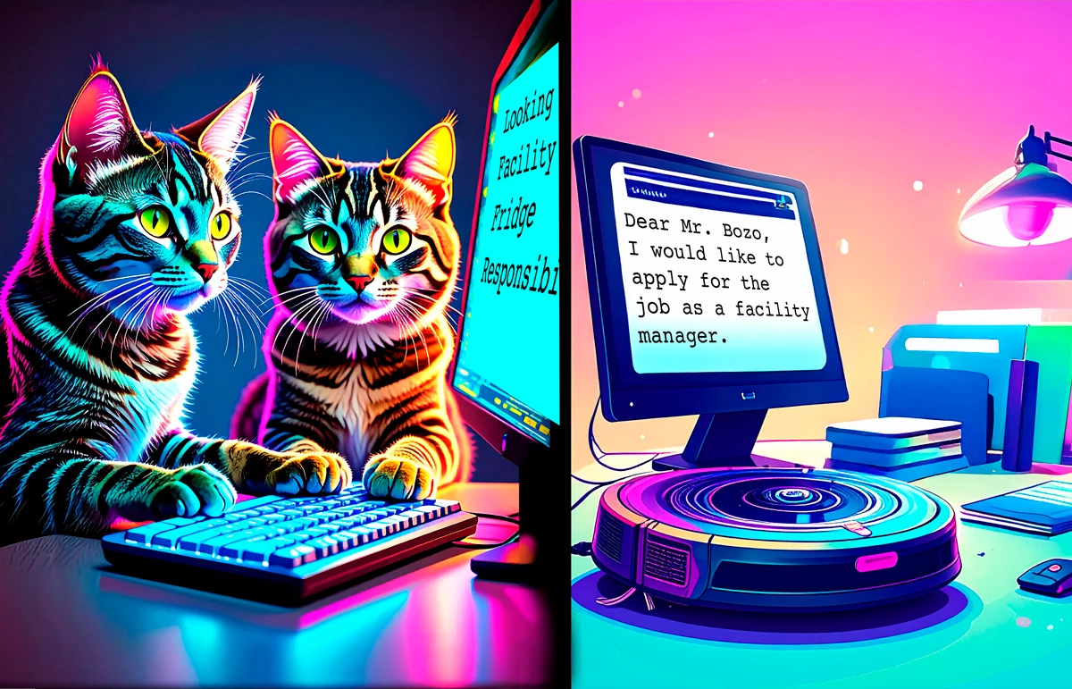 These were two generated images in Firefly. In order to get the same vibe in the vacuum robot part, I had to use the cats as a style reference, but then Firefly added cats to it. I retouched them in Photoshop, added the text and combined the two panels.