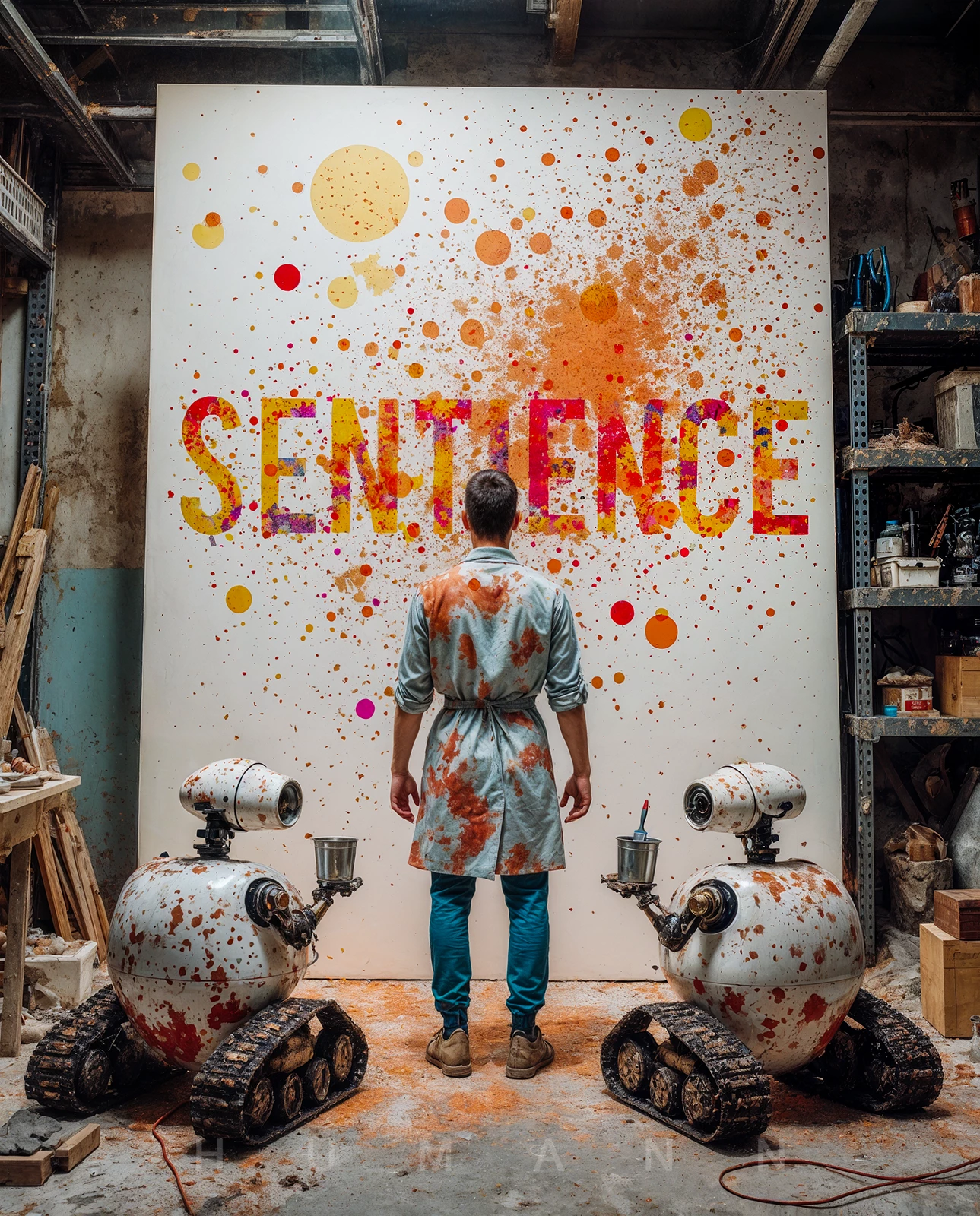In my narrative, the AI robots are the assistants hired to help the artist. Their job description includes prepping the surfaces, fetching the tools, mixing the paint, offering advice, and of course, cleaning up afterwards! As the artist contemplates his design, the robots look at each other seemingly uncertain about the design and what sentience truly means.