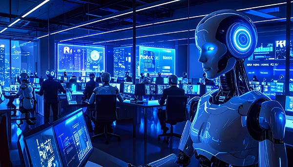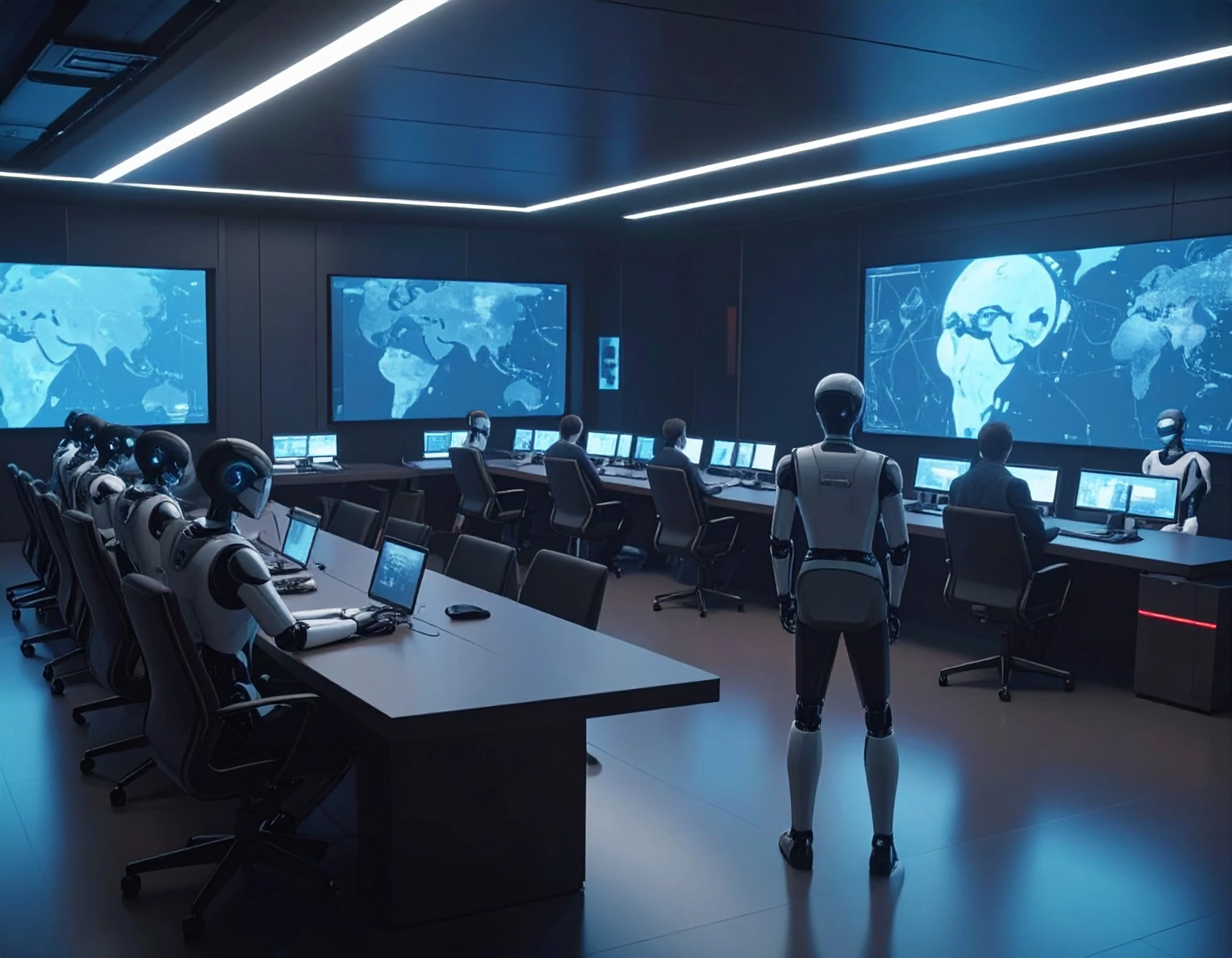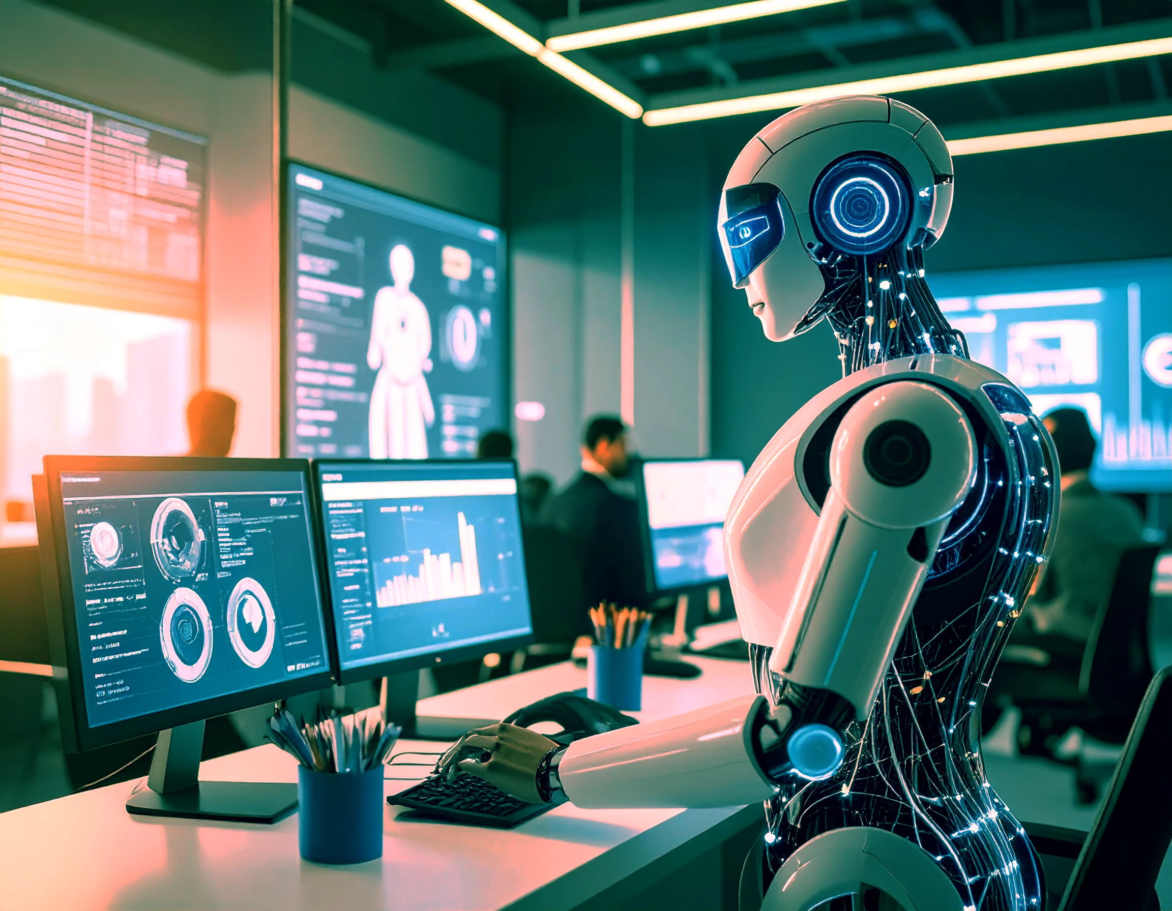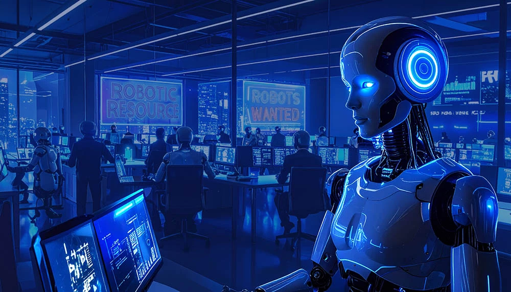 A futuristic digital painting showcases a high-tech corporate office where humanoid robots handle all tasks, bathed in cool blue lighting reflected by digital screens and glowing body accents. Amid a sea of sleek robots working in rows at their terminals, one robot is prominently featured, typing with precision, while a glowing blue "RR: Robotic Resource" sign and interactive digital displays.