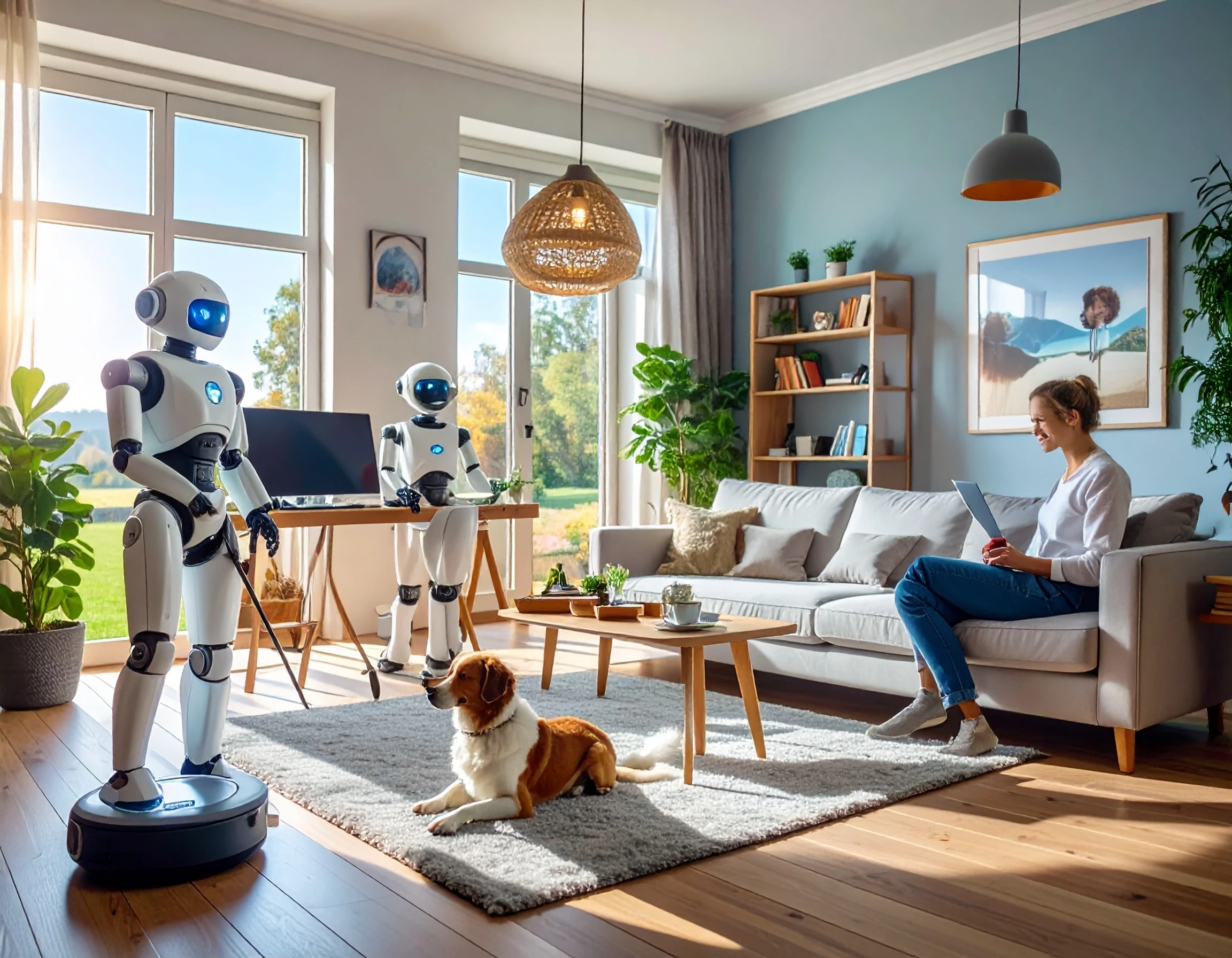 Create a seen that is futuristic workplace where bots handle the mundane while humans handle creative artwork for advertising campaign. There is a dog sitting by and robots are handling the work the people do not want to do. The home is in country and it very charming