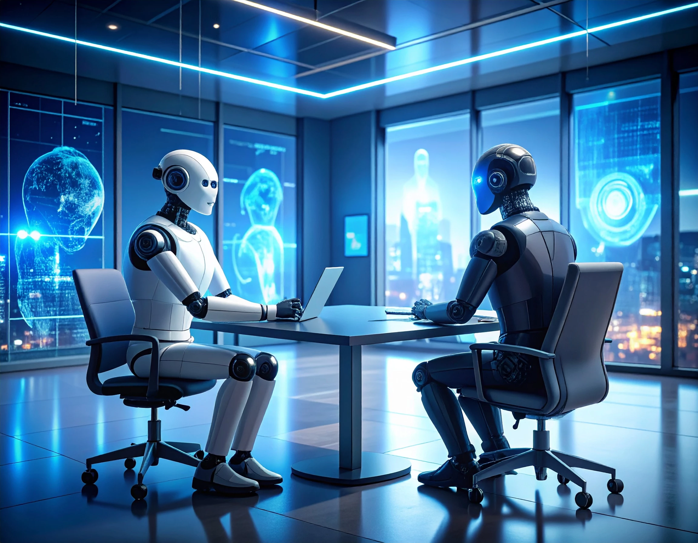 In a dark , futuristic HR office, a central robot conducts an interview with another robot amidst holographic displays and robotic onboarding stations. The scene depicts a fully automated hiring system run by robots for robots.