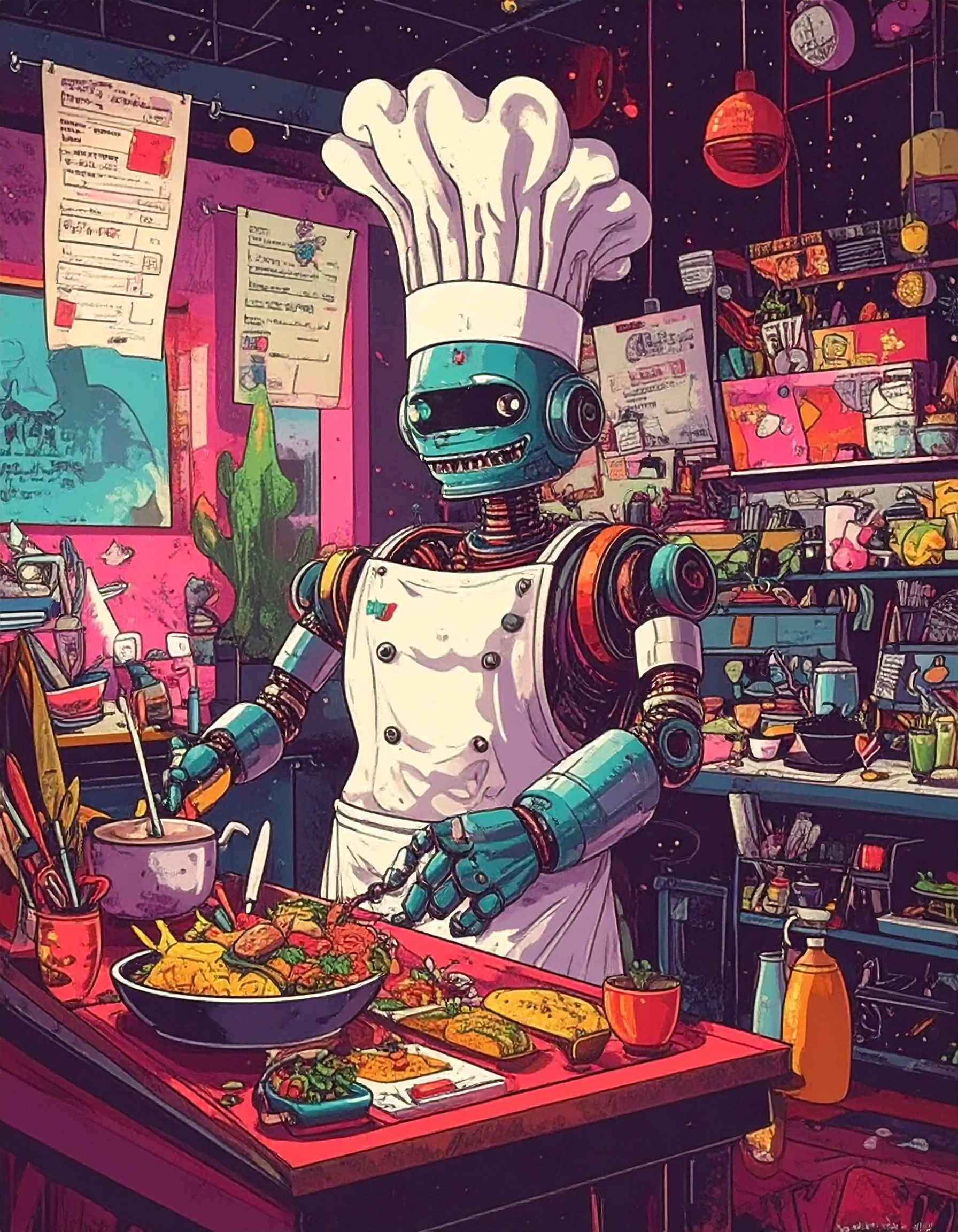 Aimed to make a robot private chef. The idea was to make the robot in a futuristic, rundown diner with lots of kitchen and cooking supplies around. I'm imagining in the future we might have robots producing fast food at an even faster and more accurate pace.