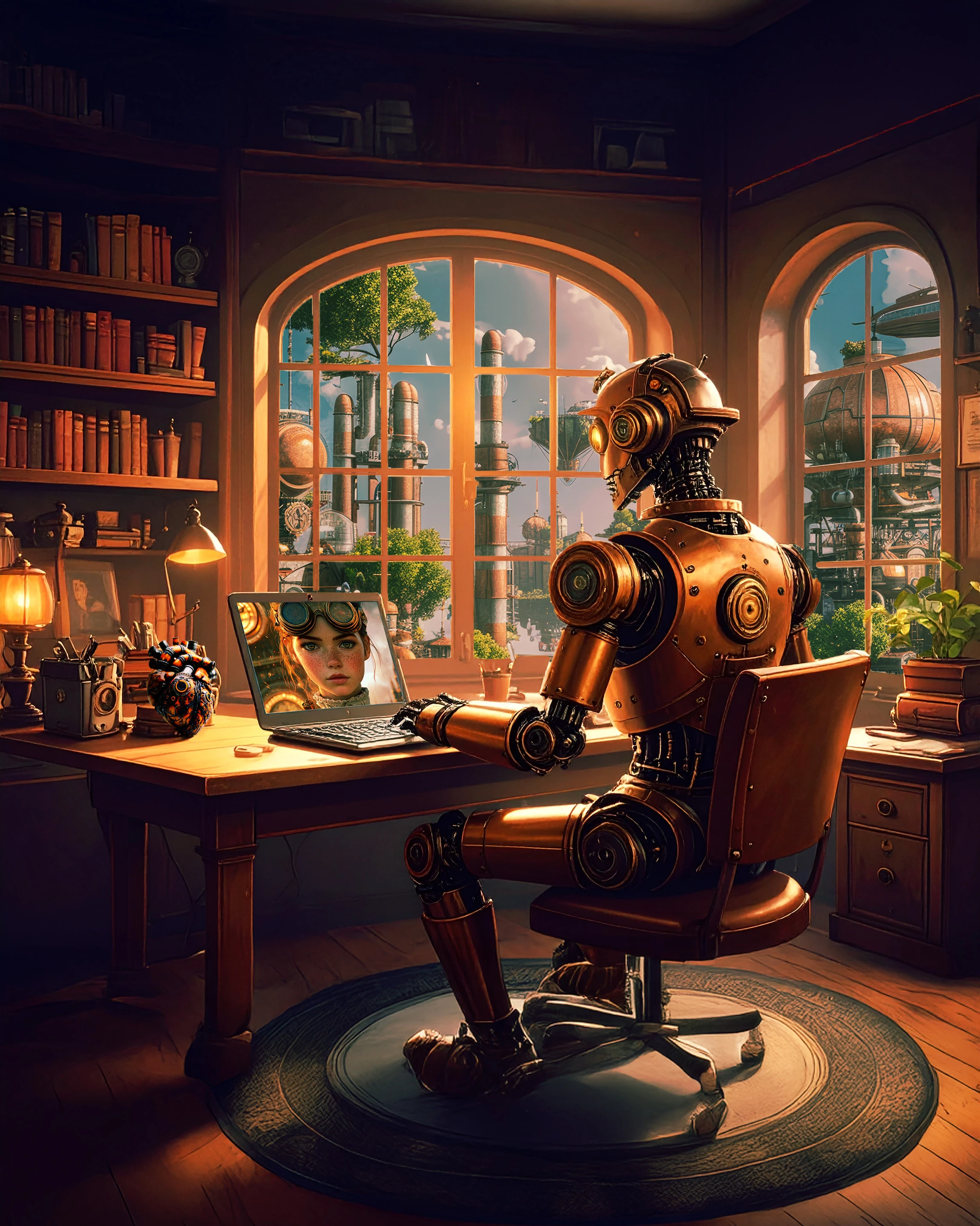So, first, I did the scene on Firefly with the following prompt : "A steam-punk robot works on his computer in an office with a large bay window opening onto the outside world in a steam-punk retro future.".