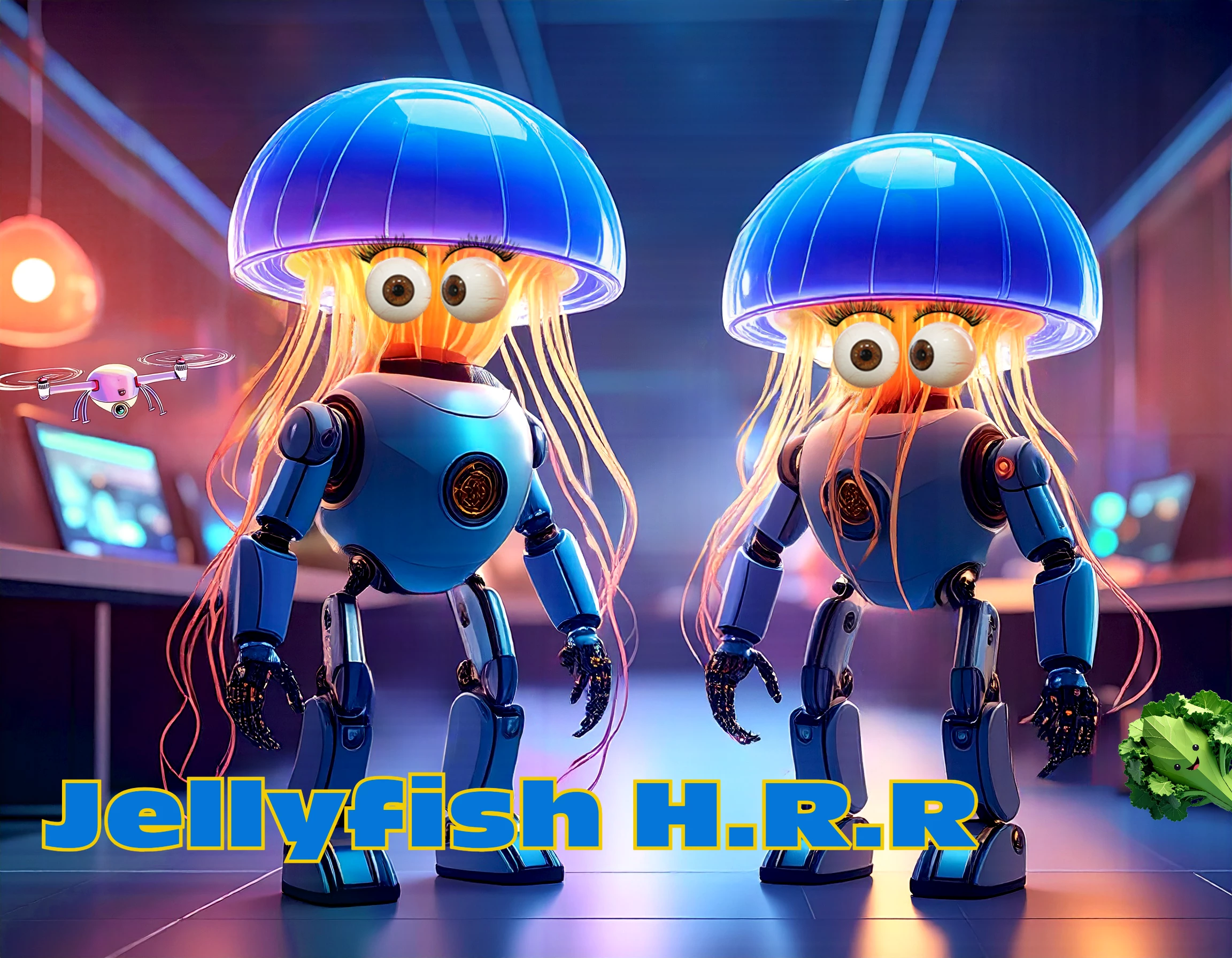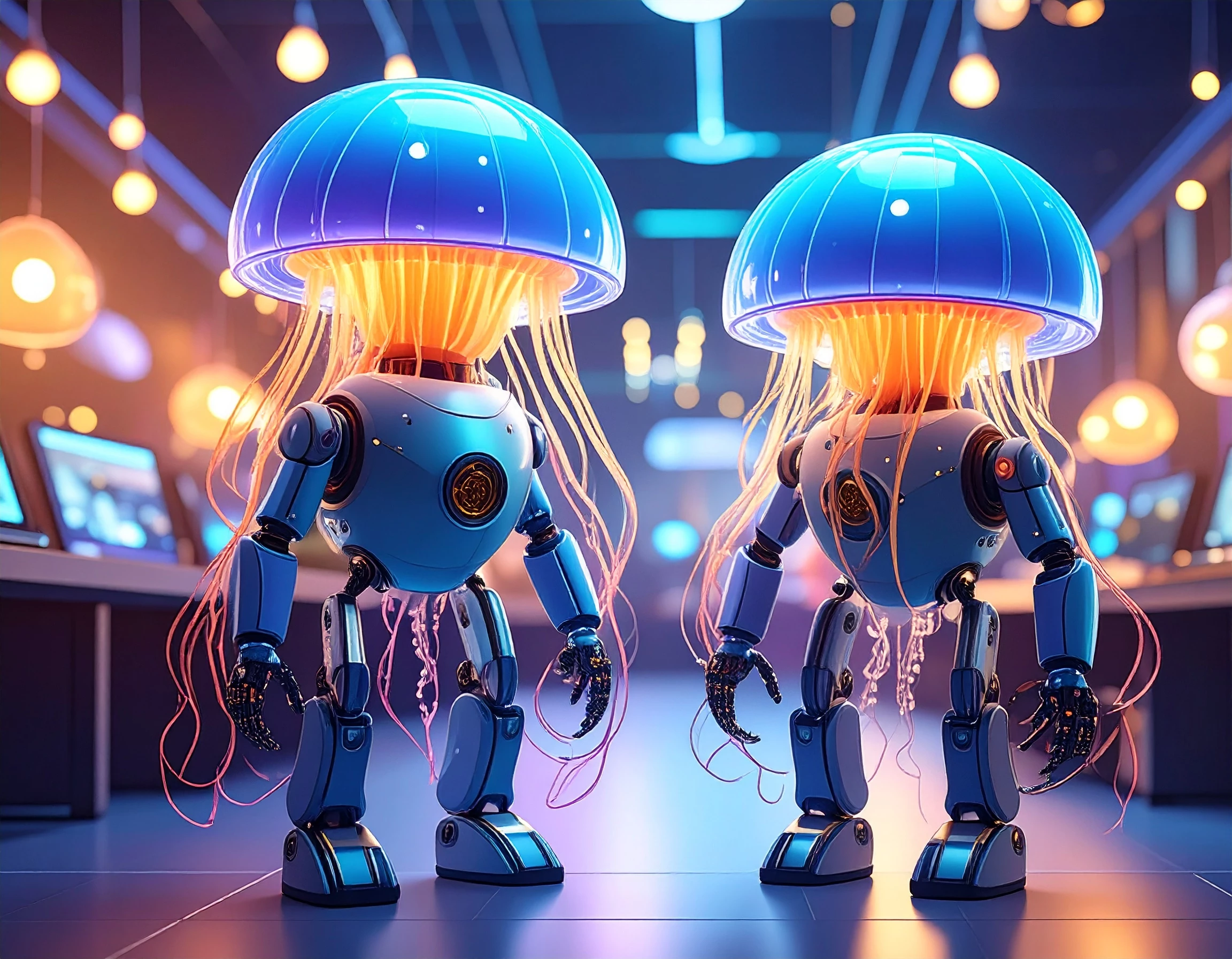 cute jelly fish robot characters, in Robot resource centre, sitting across from each other