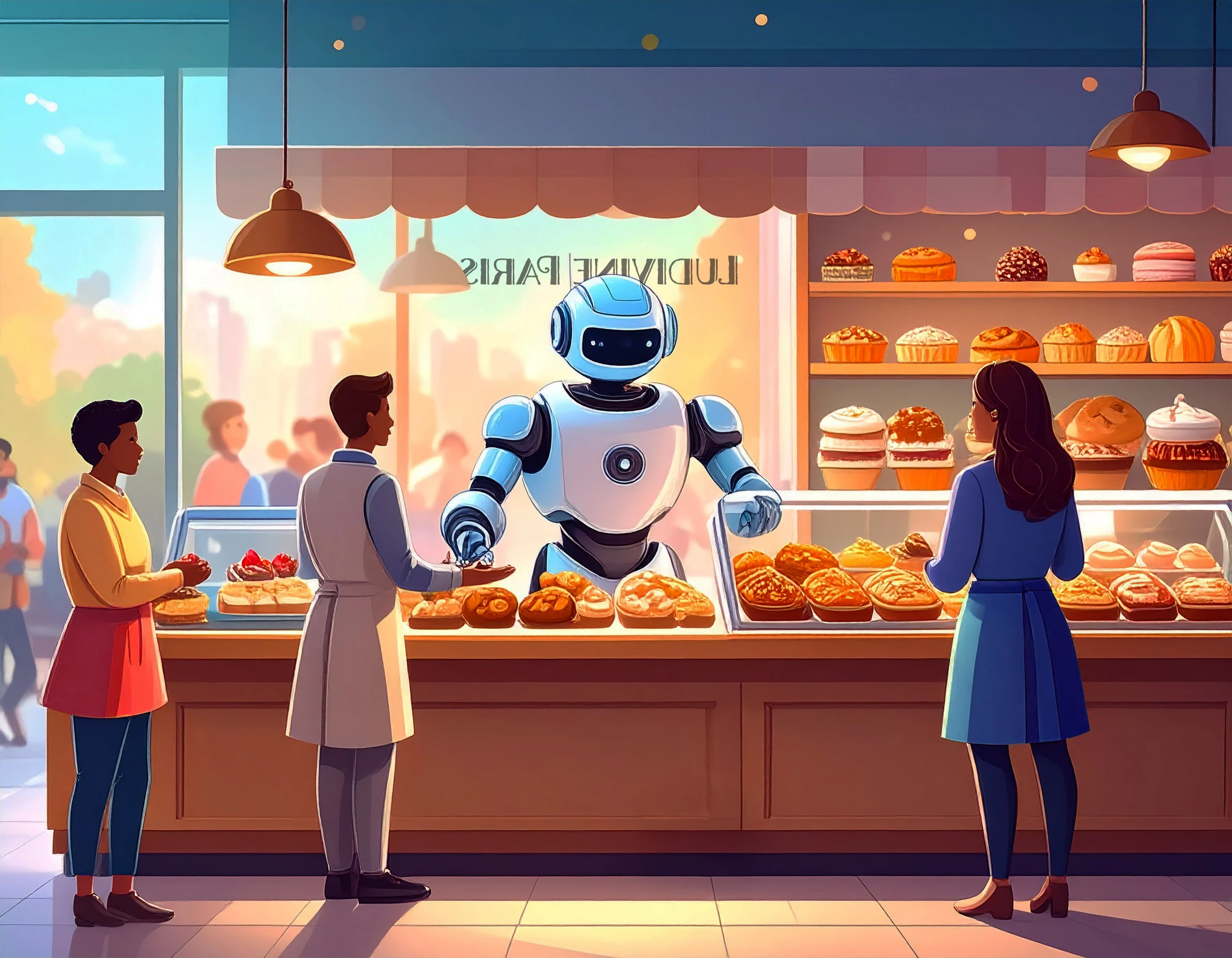 Robot working at a bakery. Photoshop to change contrast, delete some random objects, recolor some details. Illustrator to create window text.