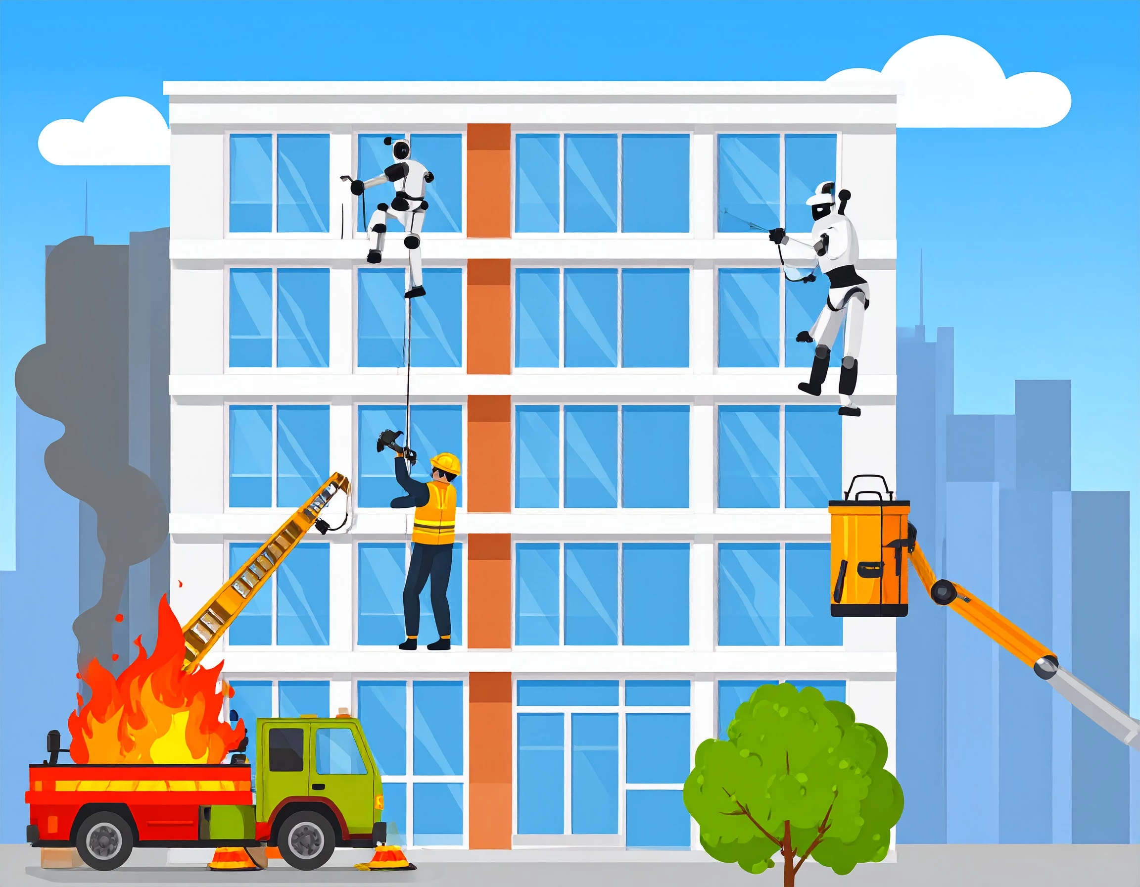 Three robots: one cleaning windows, one repairing equipment on a high-rise building, and one fighting a fire at the scene of a fire. The scenes overlap, and the boundaries are blurred.