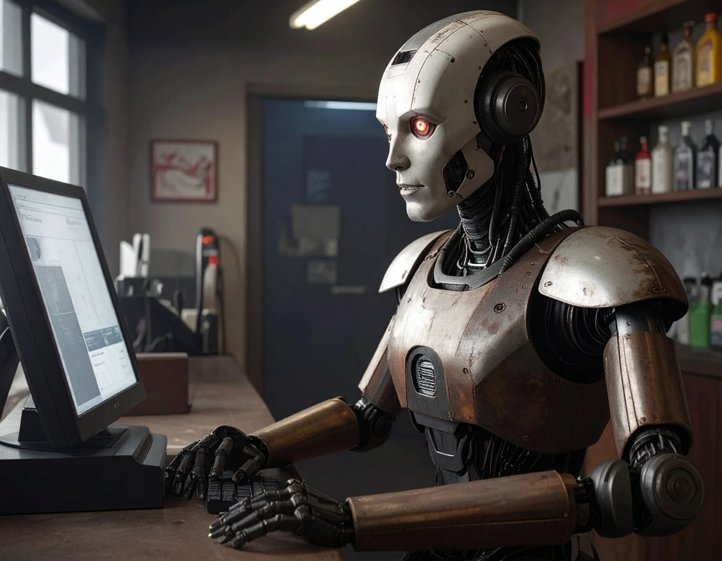 A robot working as a gas station cashier. Robot at a desk job. Boring desk. realisitc