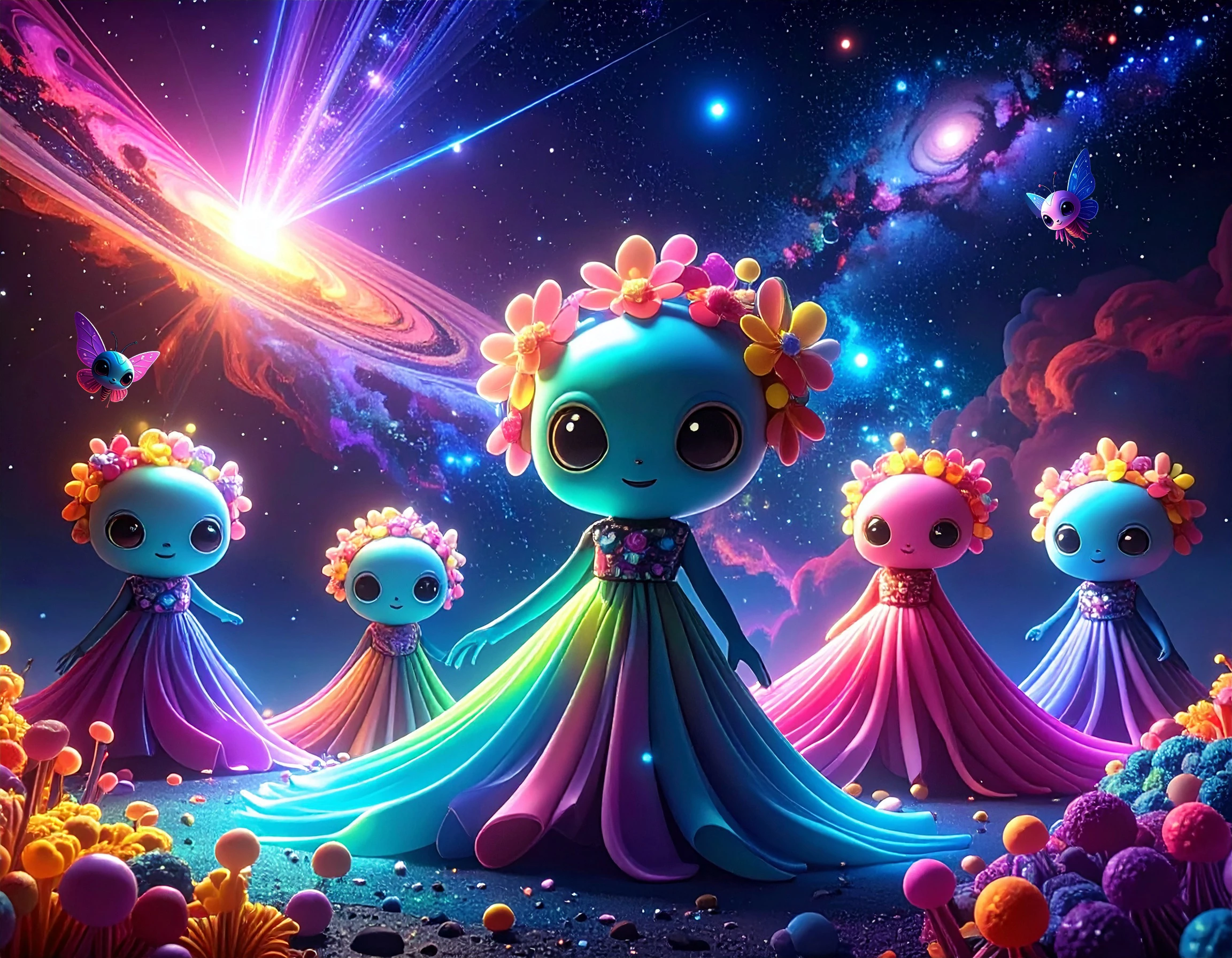 So fun! Galaxy fashion show. Butterfly aliens and flower aliens created with different prompts, composited in Photoshop, lighting corrected for composite and color changes for a little more drama.