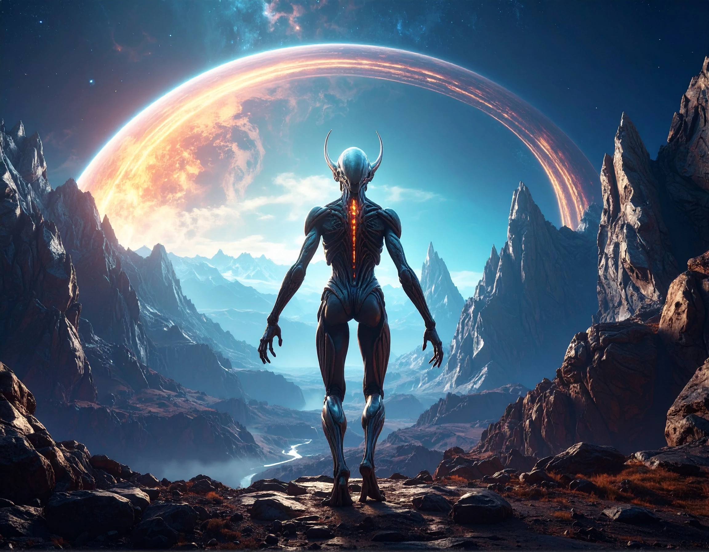 An alien predator from a low-gravity moon, with translucent crystalline armor, six elongated legs adapted for leaping great distances, and glowing bioluminescent patterns that pulse when communicating. The creature’s head has fractal-shaped antennae that detect radiation waves, and its eyes shimmer like molten metal. The background shows a jagged asteroid canyon under a massive ringed gas giant in the sky, with faint cosmic dust clouds. Highly detailed, cinematic lighting, ultra-realistic textures, 8K.