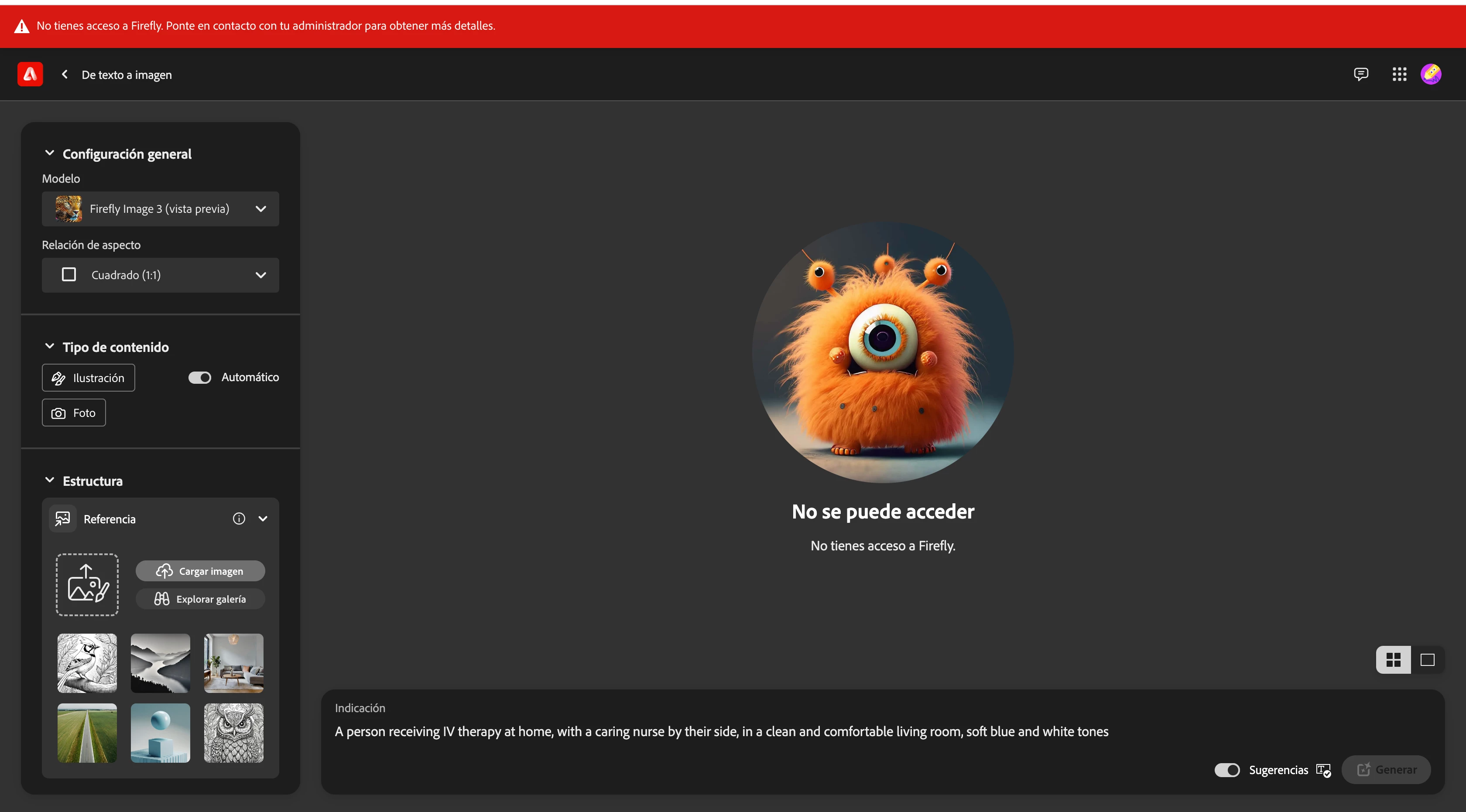 Desde hace algunas semanas, inntento generar imágenes con adobe firefly y no me da resultado, me dice que no tengo acceso