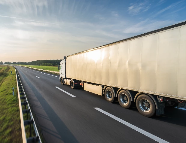 prompt: tir truck with pvc coated trailer on polish highway, vehicle moving from left side of the picture to right side of the picture and centered on image, image is taken perpendicularly to the vehicle