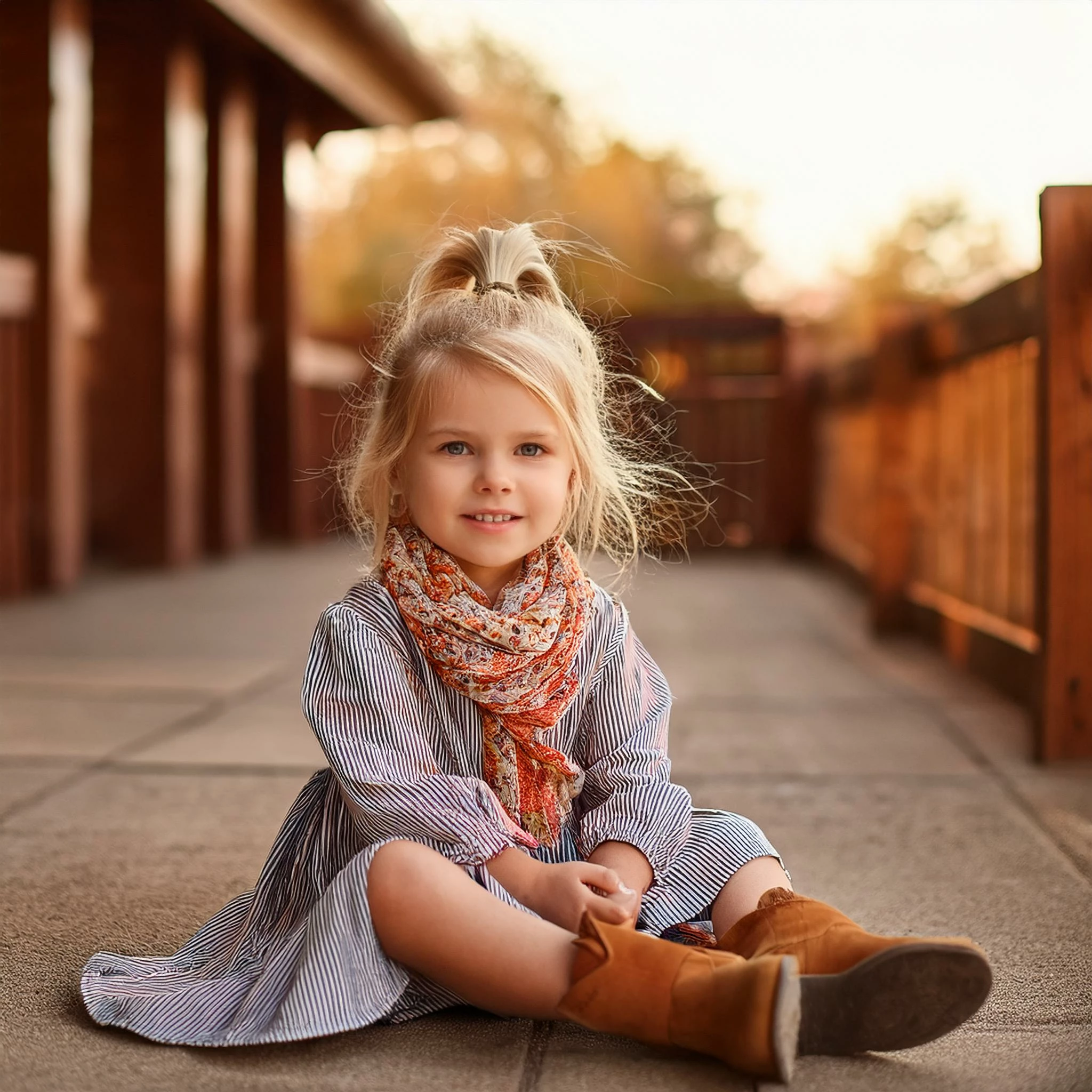 little girl grinning in a full sun dress wearing cowgirl boots. Her blonde messy hair tied up in a pony tail with a scarf. sitting on the ground
