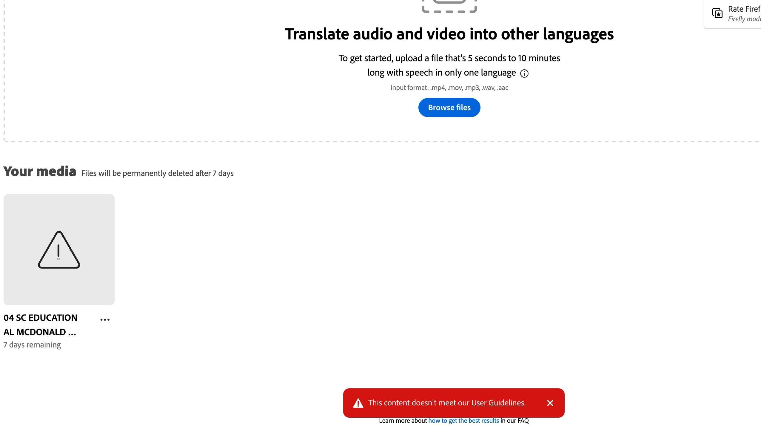 Please note that Adobe has terms of use which include guidelines for acceptable content. Those are detailed in this document: Adobe Generative AI User Guidelines. It is likely that the model believes some content in the video does not meet these guidelines. Without seeing the video and hearing the audio track, it is hard to say what that might be. Even if subjects such as illegal drug use or other topics referenced in the guidelines are mentioned in a clinical sense, for example, they still might be flagged by the model.