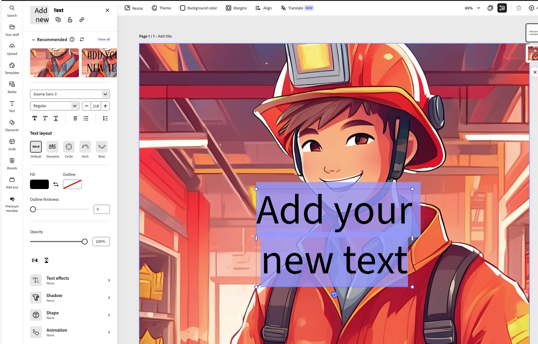 These make it convenient to perform these actions quickly by positioning you within that function in Adobe Express. For example, if you select Add Text, it will take the image to Adobe Express, add a text block on the image and show the text control panel on the left. Since we have all experienced how AI image generation does not always get text down correctly, this can help you add the right text using the font, size, and colour you want.