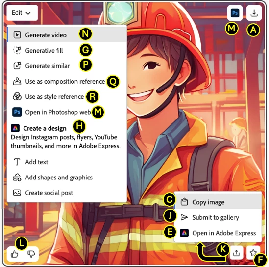 You can also send an image to Firefly Generative Fill if you want to make a change to a generated image. You can access that on the Edit menu in the upper left of the image as shown in “G” on the example image above.