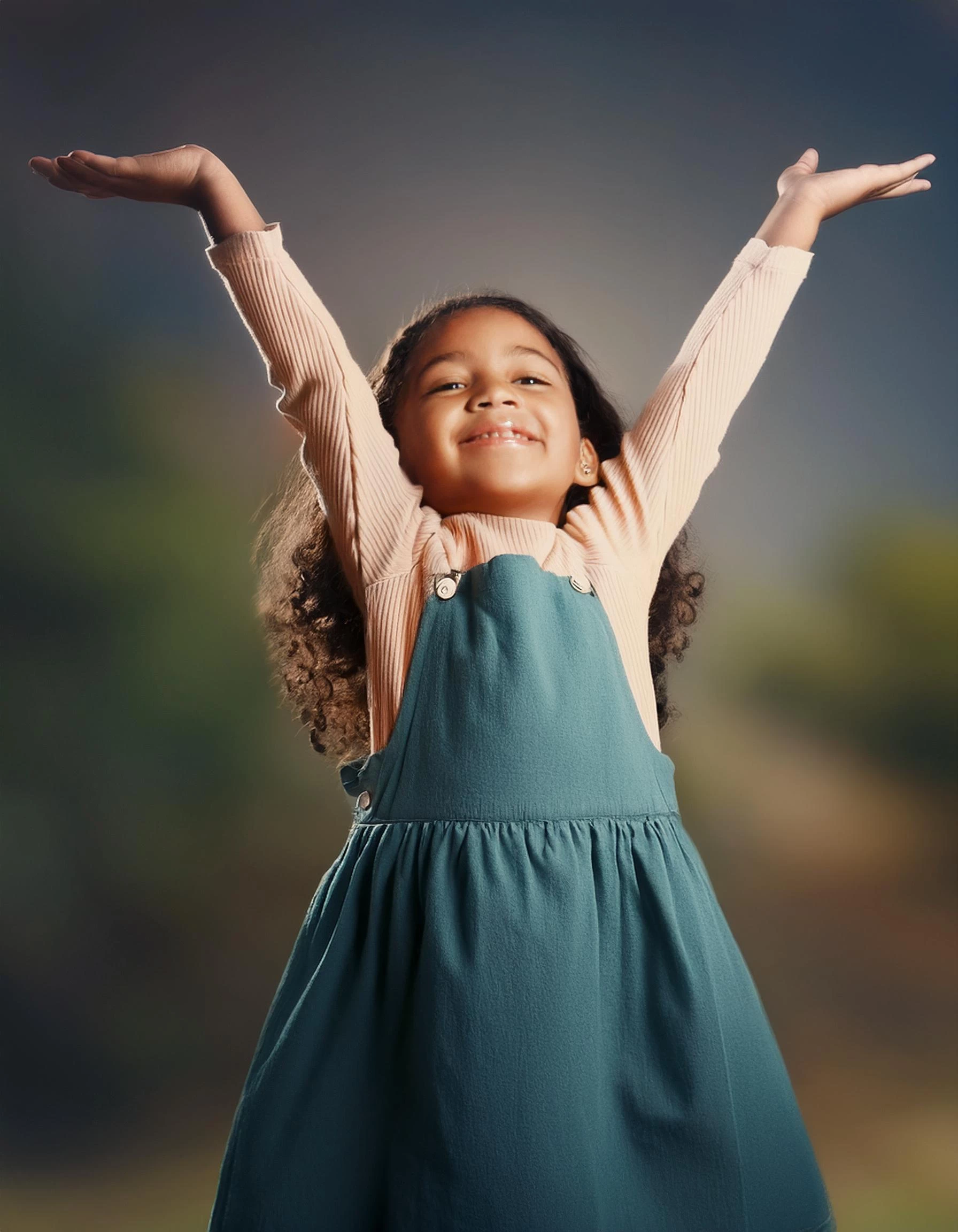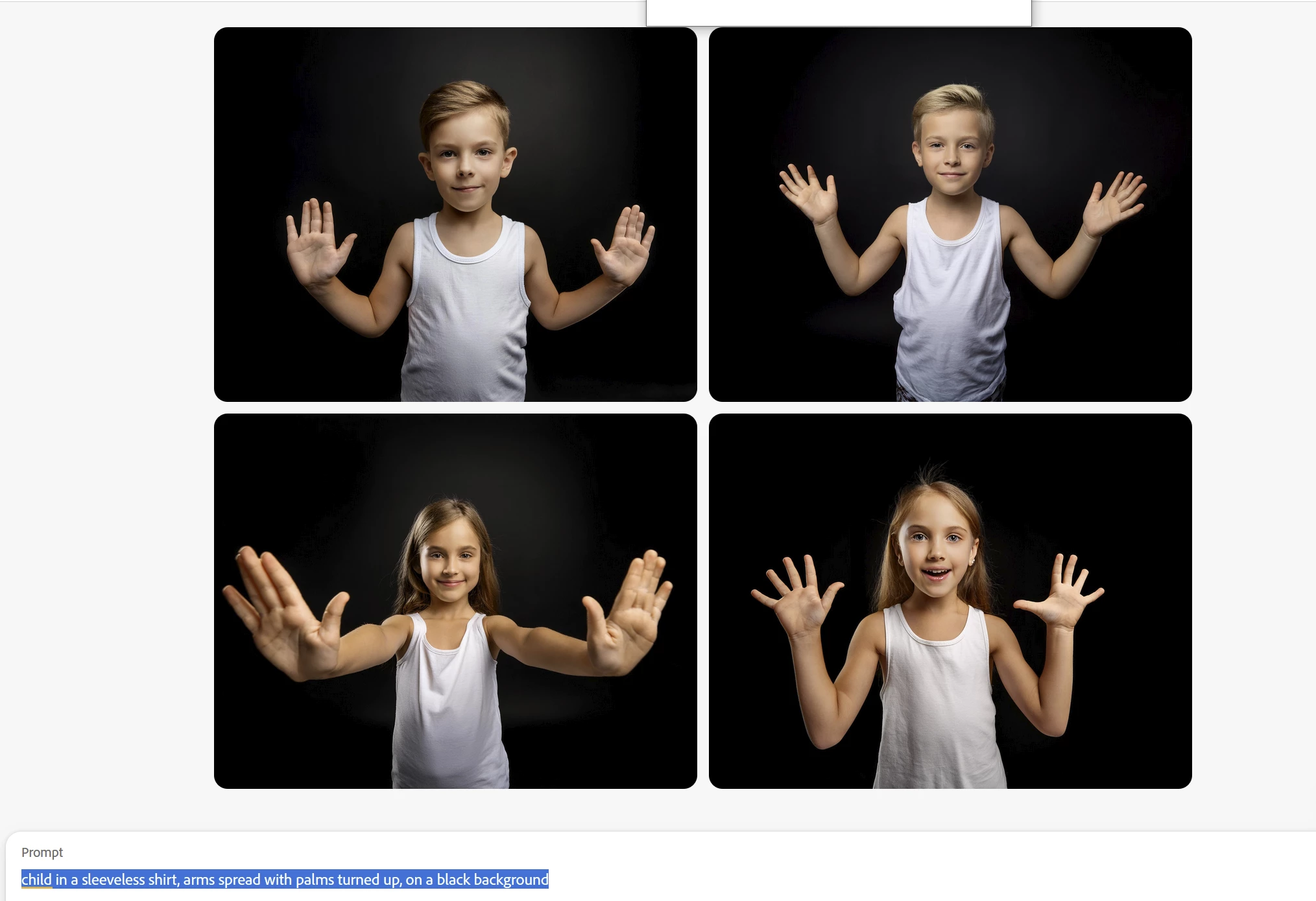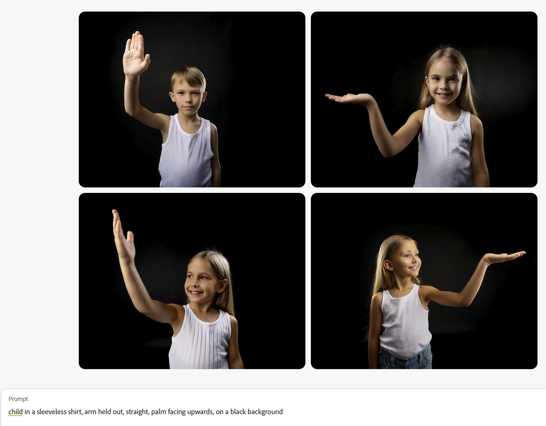 I've tried a lot of variations of the prompt "child with arms spread, palms facing up" I need for an anatomy illustration, but instead of a shrug I keep getting some sort of "you're under arrest"-pose