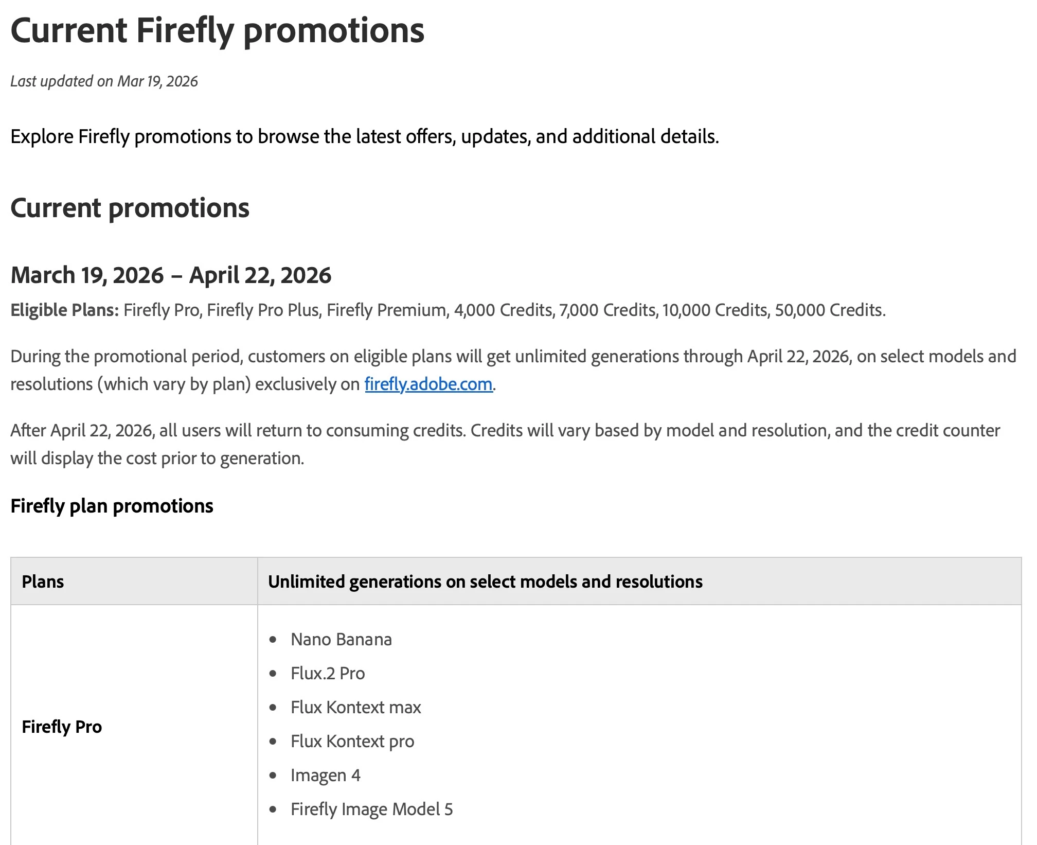 Hey everyone. I’m on a CC Pro plan with 4,000 Firefly credits per month. Adobe’s running a promotion with “unlimited generations on select models”. I’m grateful for the promotion, but I’m still having credits deducted from my balance when using those models covered by the promo. How do I fix that?