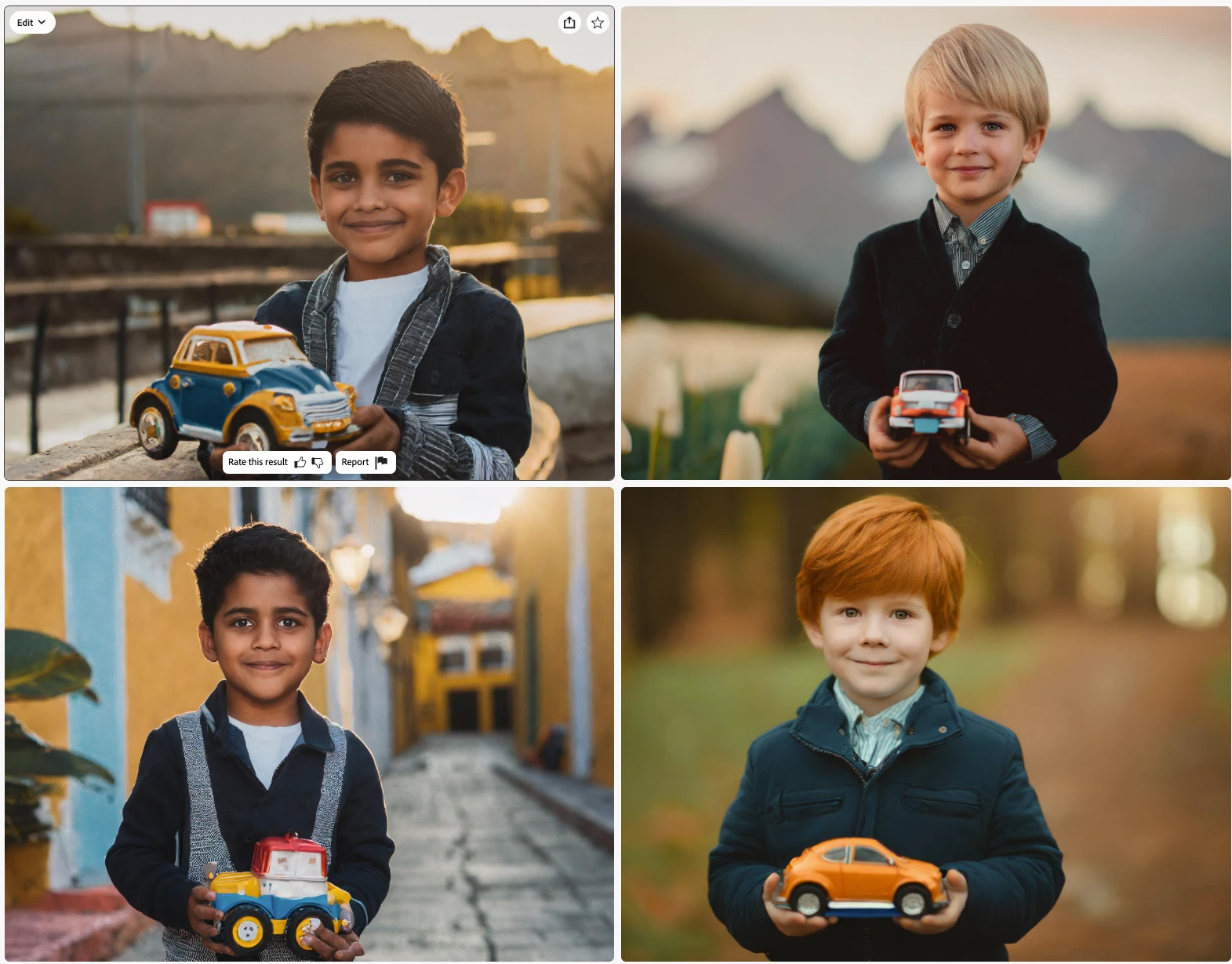 Stating in the Generative Text Box: Boy not wearing glasses, generates all images of boy wearing glasses.