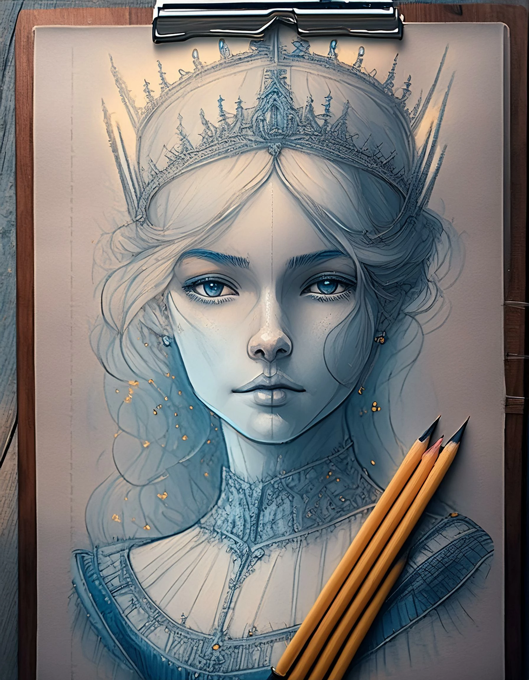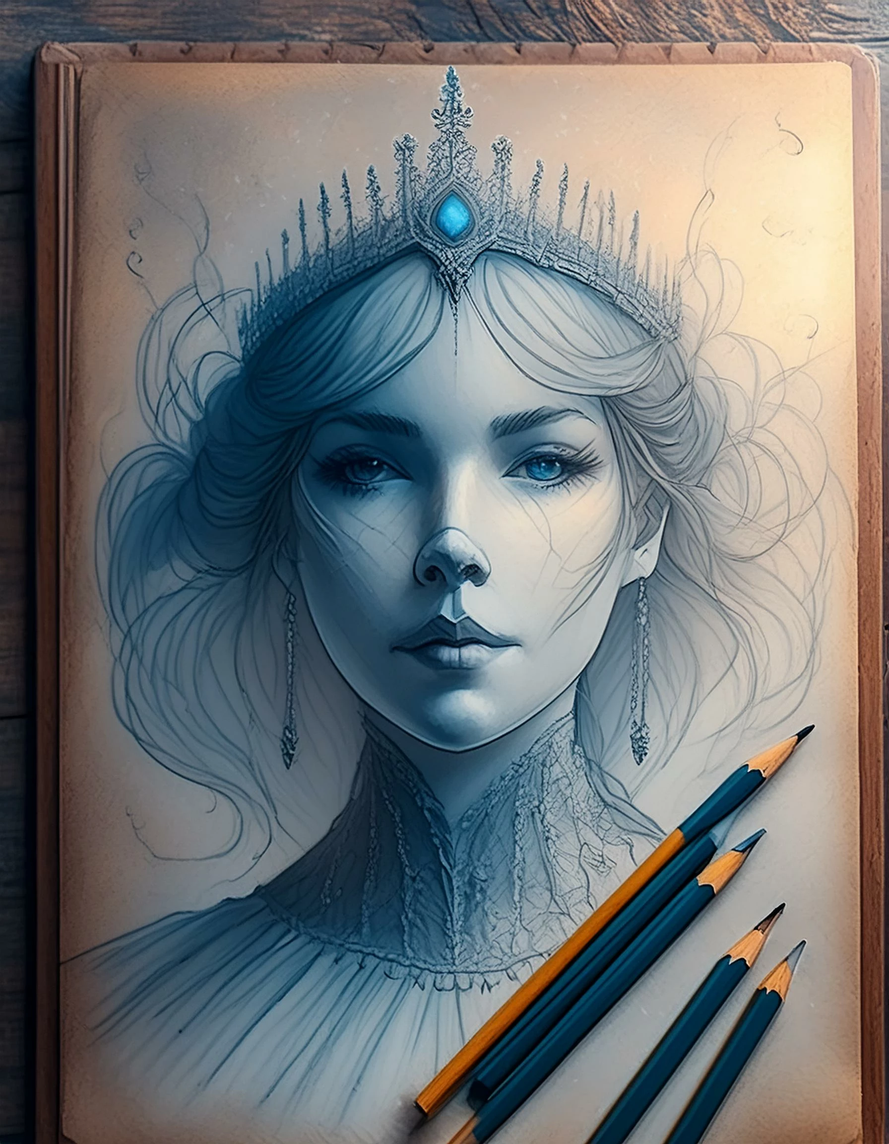 A drawing pad,a drawing of cinderella in a beautiful light blue dress,pencils,an old table,storybook illustration