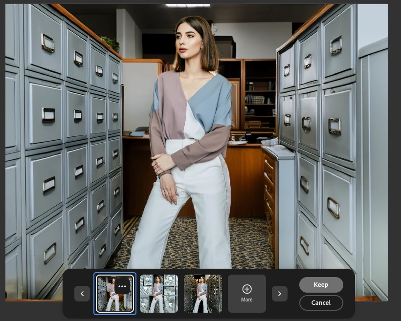 You can accept one of these by pressing keep, or generate again (⊕), or cancel and re-edit your prompt. After you are done editing, you can click Download at the top to save: