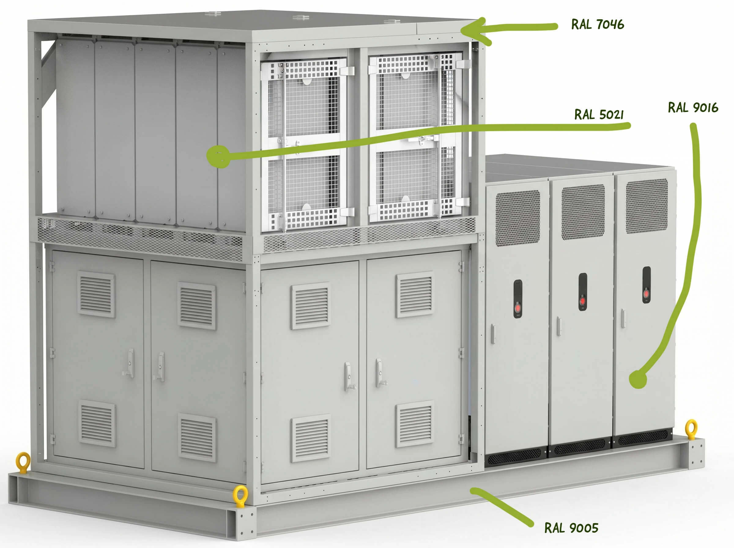 Use Image 2 (New Unbranded System) STRICTLY for the absolute structural layout, physical proportions, geometric shapes, and composition (including the PCS cabinets, transformer cabinets, and support structure).