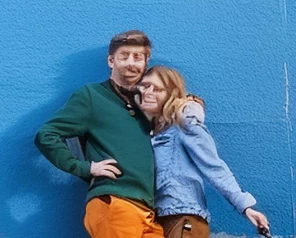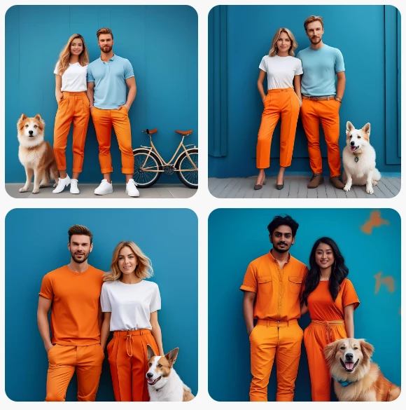 "4K photorealistic image with clear convincing faces. A man and a women is standing in front of a blue wall happy. They have a big dog. Their trousers are orange ."