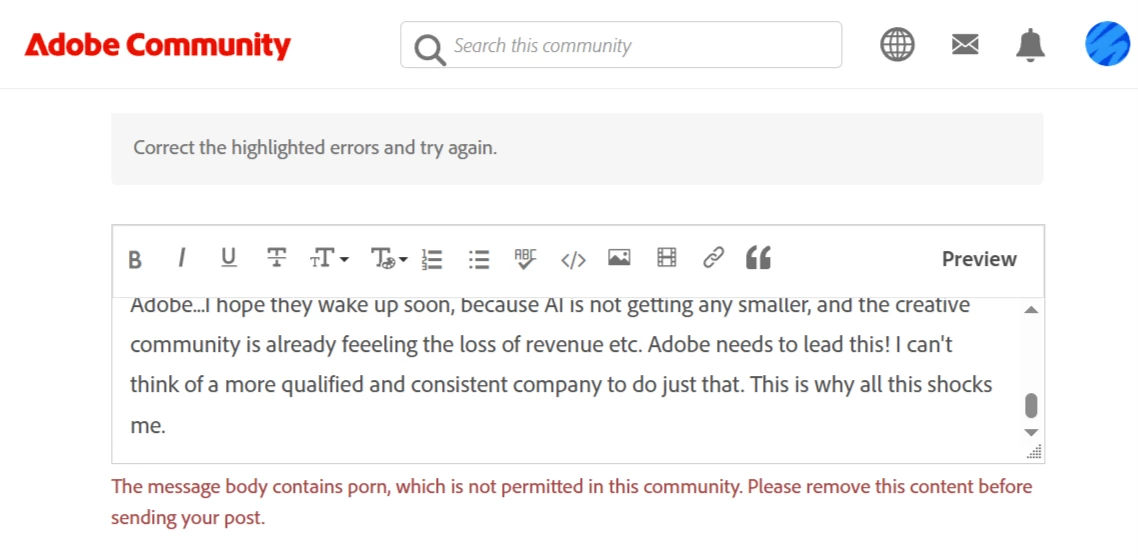 Now, if I EVER attempt to put a photo of an adult woman in Firefly, it's a lock it won't work...Adobe seems to have decided that the few creeps, not surprisingly using AI to enhance their creepiness, is a good enough reason to basically not allow females? The program legit makes you feel like a creep as well...for nothing! On that note, the last female I attempted to use in an AI vid was my sister...when she is around 7 years old! I added 2 photos of my sister and I as kids. I thought it would be a really cool addition to the gift I got my father for his birthday on Saturday. Firefly had a cartoon moppy headed thing dancing durubg the render, and then a cartoon goat broke the bad news. I tried so many combos in ratio, frame rate, you name it. "Something Wen't Wrong" is not what professionals want to be told...No, we want/need/demand WHAT WENT WRONG?! At least this allows for troubleshooting with some modicum of intelligence. So what gives???! 🤷♂I tried every algorithm, preset, frame rate, resolution, encoder...you name it, including the 3rd party ones, I tried basically every variance I could think of...The only thing I know, is the rare success I had, was when I made a video of only myself...a male. PS I looked really creepy...they have a ways to go just with the art quality alone! It seems Adobe has gone beyond extreme with their AI Safety tactics...I don't think altruism is the reason though, they just don't want to get sued. Adobe should realize that AI, whether we, as artists/creatives, like it or not, we are going to have to learn it and use it. Adobe has been THE go to for all my visual, artistic endeavors...Now Adobe seems to be creating nonstop programs, instead of their old tactic of a few solid, go to professional programs that work together perfectly.