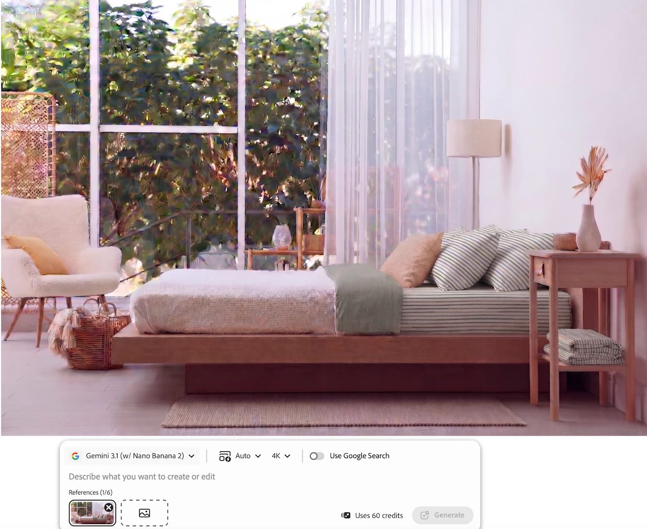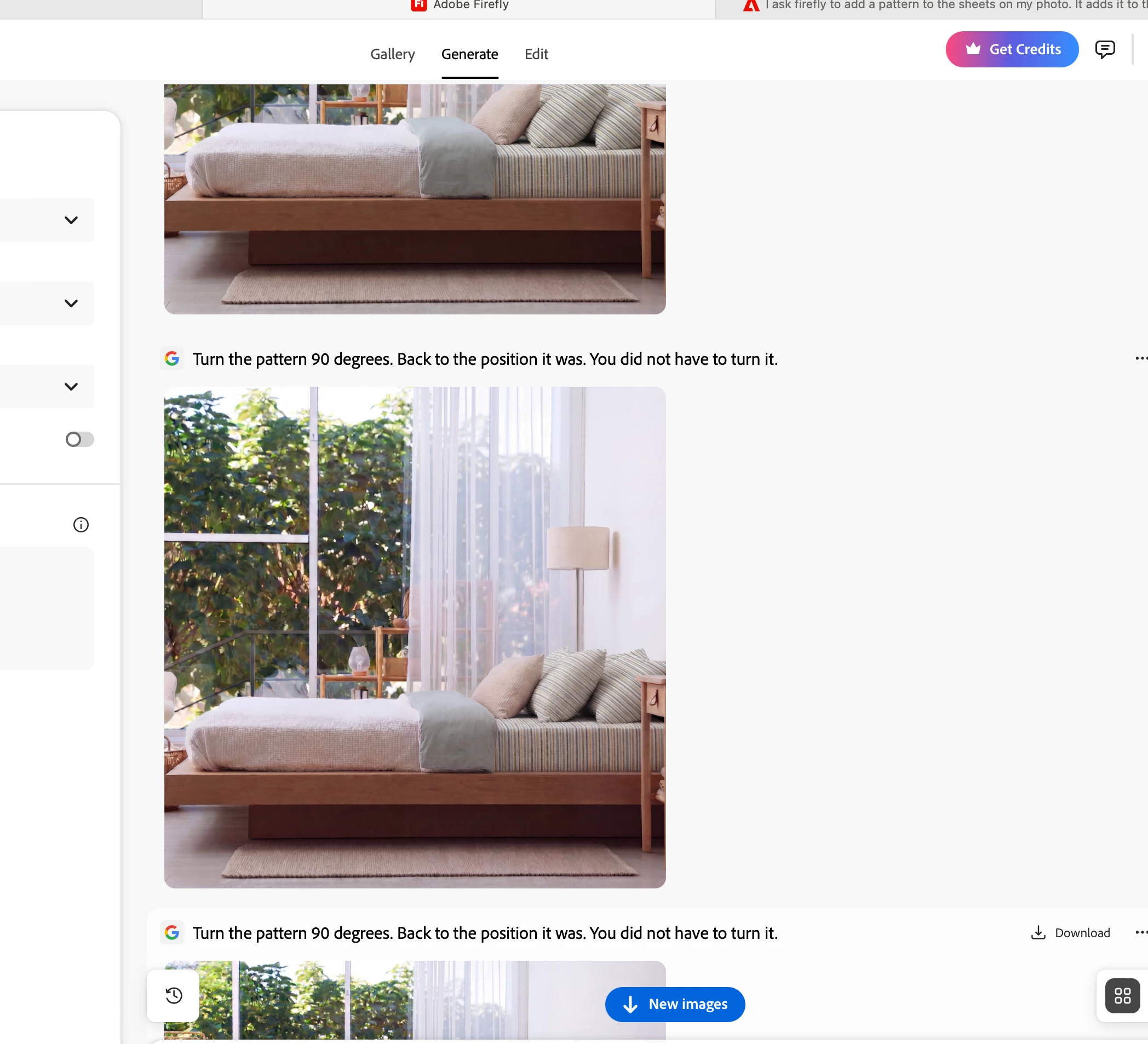 I ask firefly to add a pattern to the sheets on my photo. It adds it to the blankets and sheets. I ask to turn the pattern 90 degrees it could not do it.