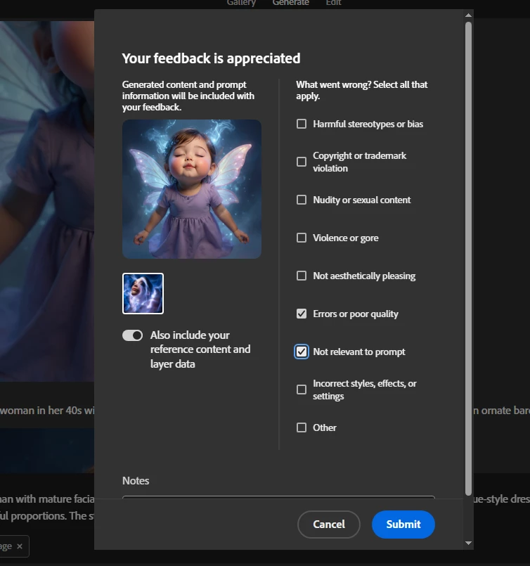I described an Ig=mage that I wanted to generate . The image was great and I wanted to add two scuba divers that were the same scale as the other figures in the image as if they were actually y part of it. I tried three times with out success This was my last instruction and I attach the image. “add two scuba divers one with a lamp and the other with the a camera they should both be swimming around the deck of the wreck and be of a similar size of the other human figure around the deck make sure there is a small stream of bubbles coming for the breathing regulators of each diver. make them seem part of the image not just stuck on as an after thought. The divers are still too big half the size should be good. The scuba divers look good but are still much too big in relation to the other figures and should be more involved with the ship wreck.” https://firefly.adobe.com/generate/image?trackingid=BJ4T364Q&ff_channel=adobe_apps&ff_source=Creative+Cloud+Desktop&ff_campaign=CCD_blade&ff_content=card1_t2i&ff_audience=CCE&ff_campclass=brand&ff_camptype=app&product=Creative+Cloud+Desktop&product-version=6.8.1.856&view=edit&mv=in-product&mv2=accc&mv=product&mv2=accc&mv=product&mv2=accc